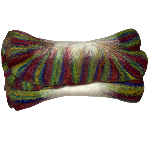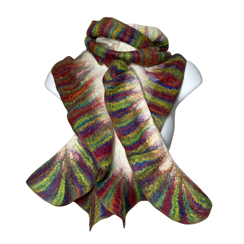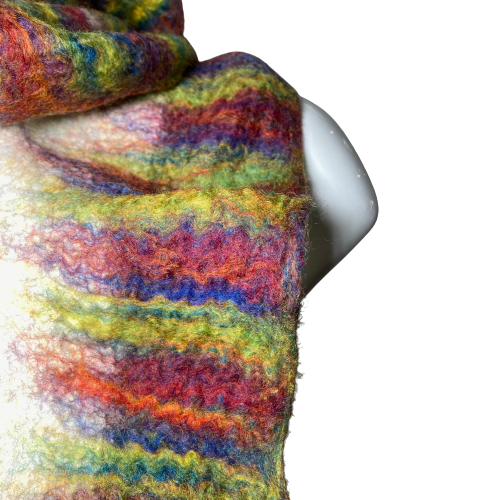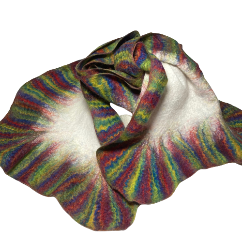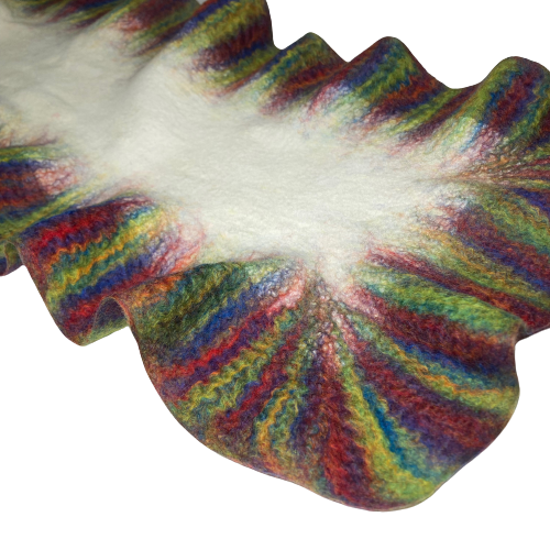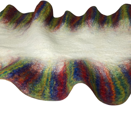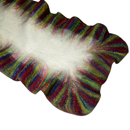 The central white band consists of unbleached white merino wool fibres that are felted in a very fine layer onto both sides of a silk chiffon fabric in a process known as Nuno felting. The woollen fibres migrate through the silk and bind with it to create a strong but lightweight fabric. The multicoloured border added around the edge consists of a blend of merino wool fibres that are laid out and manipulated during felting in such a way that the border forms in a wavy, ruffled effect.