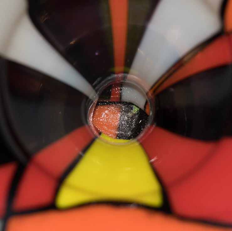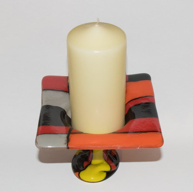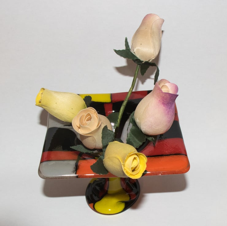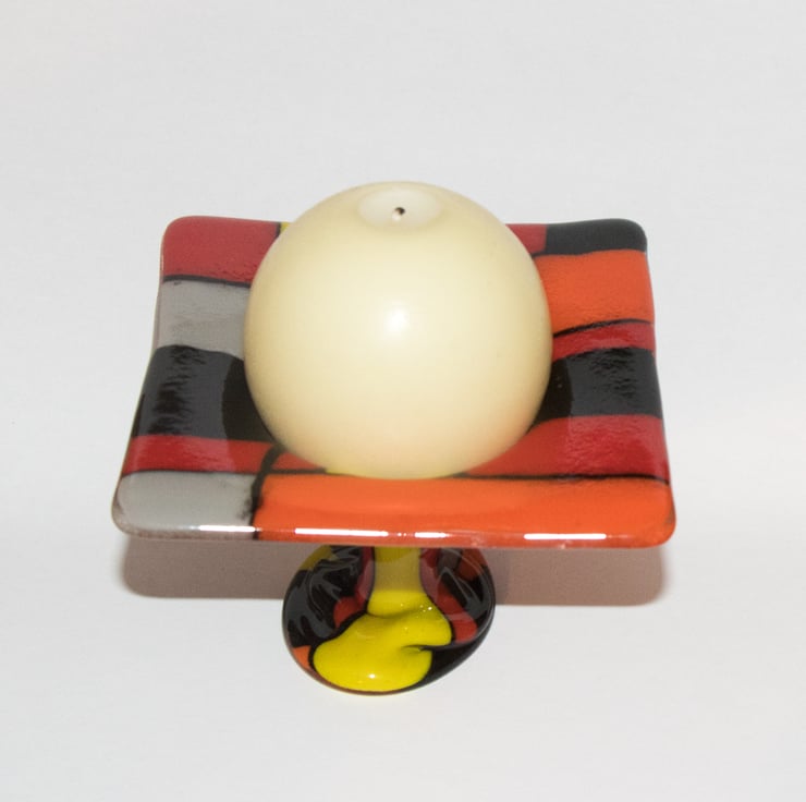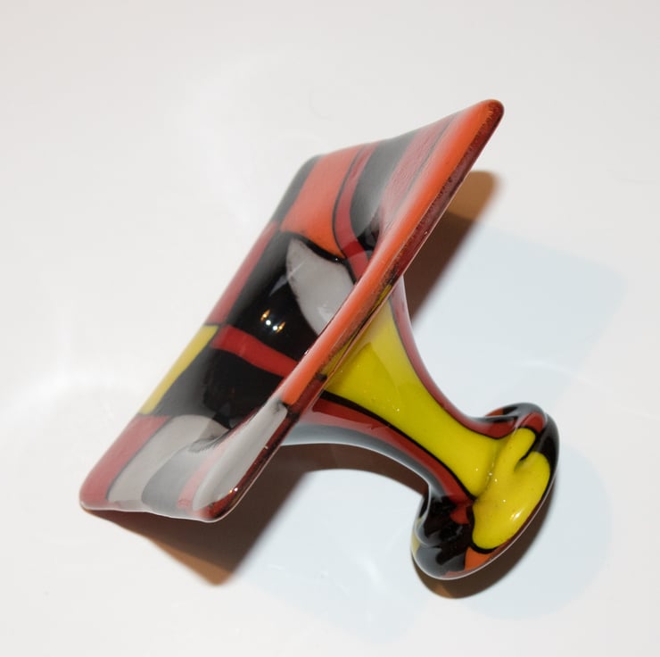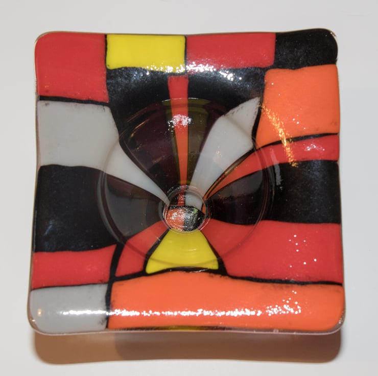It is made from squares and rectangles of coloured glass which have been hand-cut to fit over a clear glass square. Any gaps between the glass have been filled with powdered glass before the piece is treated to an initial session in the kiln which fuses everything together. A second visit to the kiln with the square placed on a doughnut-shaped mould which is supported well above the kiln floor allows the glass to flow into this organic shape. You can see the effect this has as the glass is stretched.
