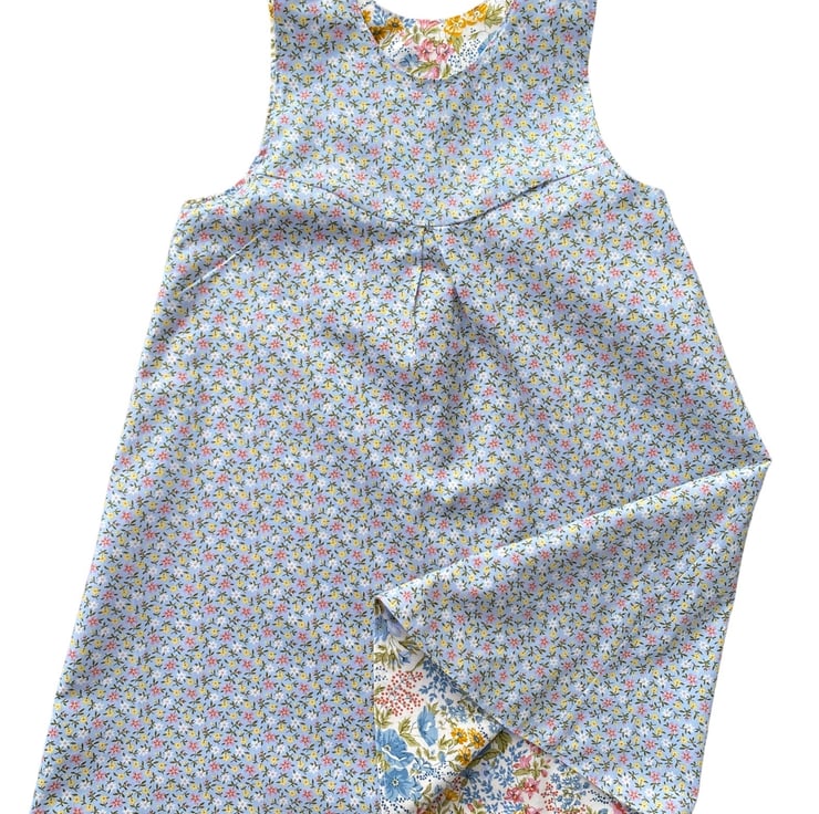 Quality Cotton Fabrics used to create this blue floral reversible pinafore dress. Larger floral pattern on one side and co-ordinating mini floral design on the other.