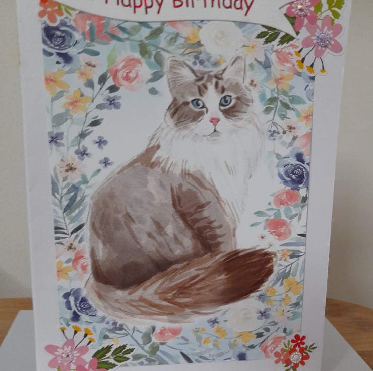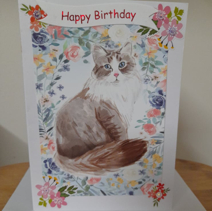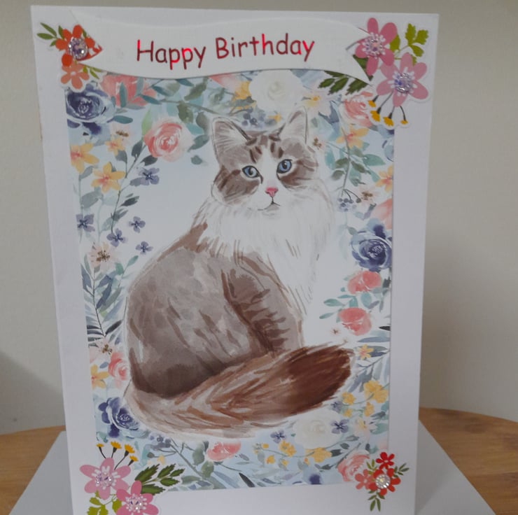 CUTE BIRTHDAY CARD DESIGNED AND HANDMADE BY MYSELF, WITH A CUTE PERSIAN CAT SURROUNDED WITH BEAUTIFUL FLOWERS WITH LITTLE RHINESTONE FLOWERS ADDED.