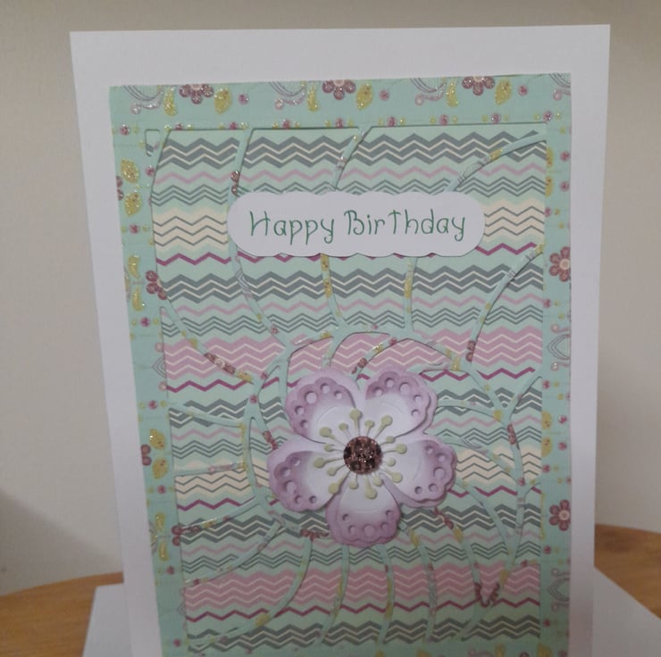 THE CARD HAS BEEN MADE USING A WHITE BLANK CARD WITH ADDED PATTERNED CARD DIE CUT TO ASSORTED SHAPES AND WITH A HANDMADE FLOWER AND RHINESTONE TO FINISH.