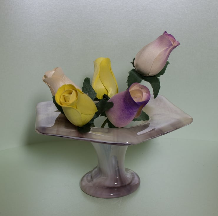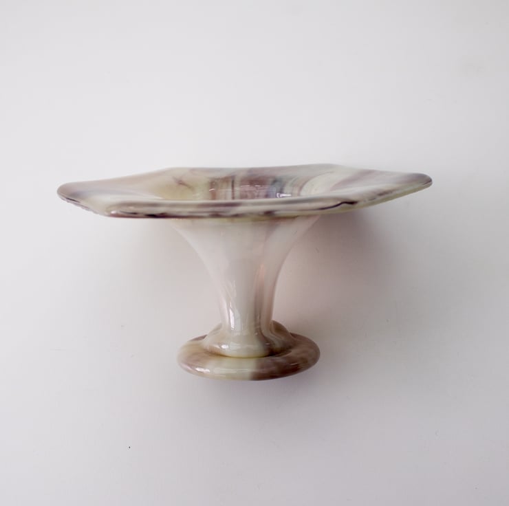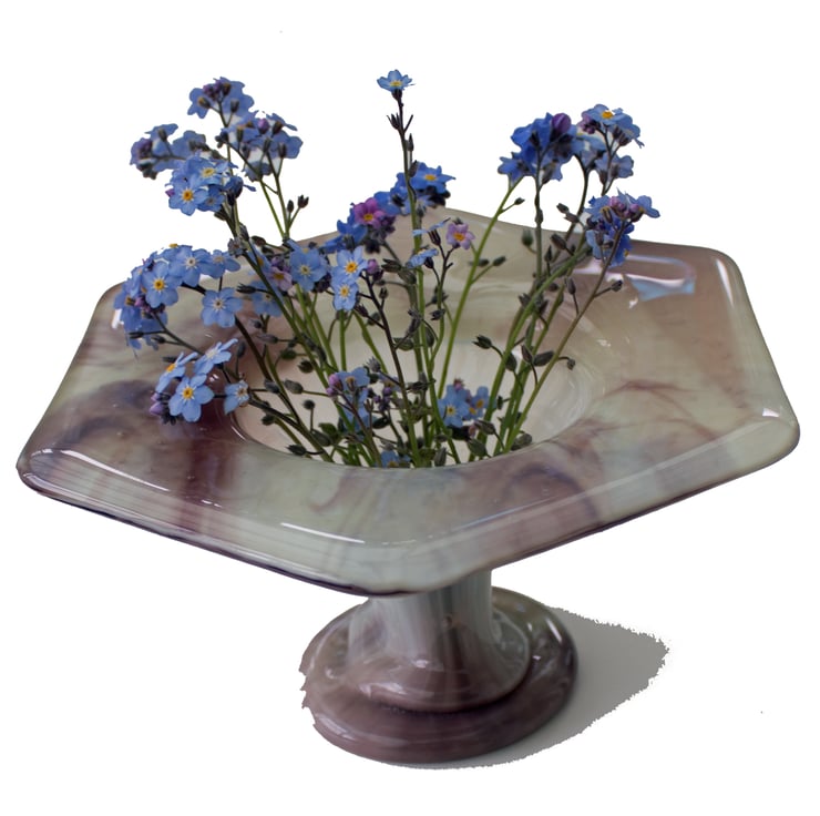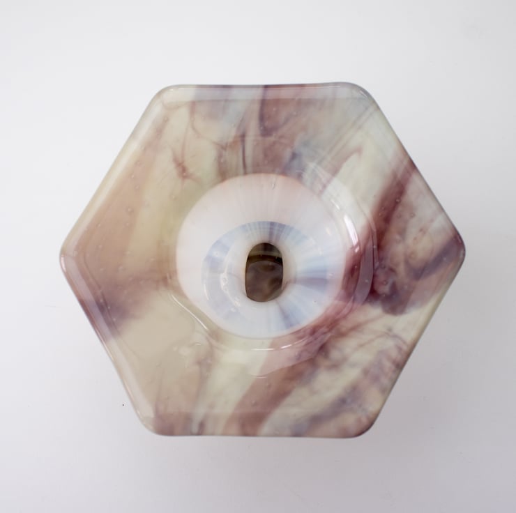 It is made from a hand-cut hexagon of streaky glass overlaid with a hexagon of clear glass. An initial session in the kiln fuses everything together. A second visit to the kiln with the hexagon placed on a doughnut-shaped mould which is supported well above the kiln floor allows the glass to flow into this organic shape.