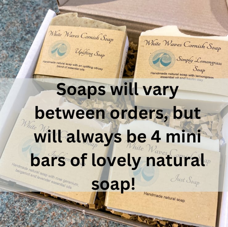 A box of 4 half sized luxurious natural handmade soap bars, postage included.