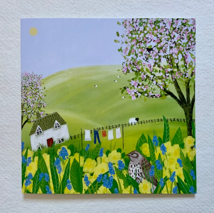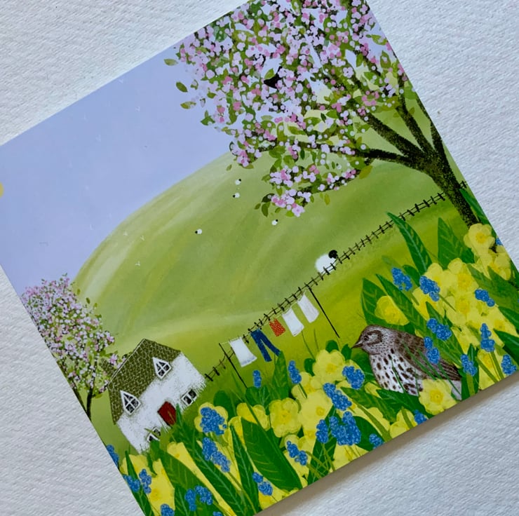 This card has been printed from an original painting that I did, featuring a lovely cottage and garden amongst the cherry blossom trees. It is a blank greetings card making it suitable for a variety of occasions. It measures 14.5x14.5 cm and comes with an envelope.