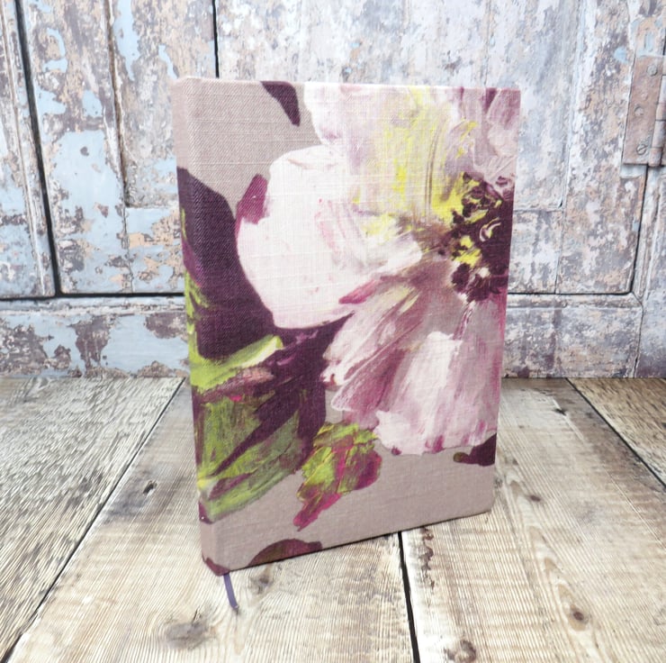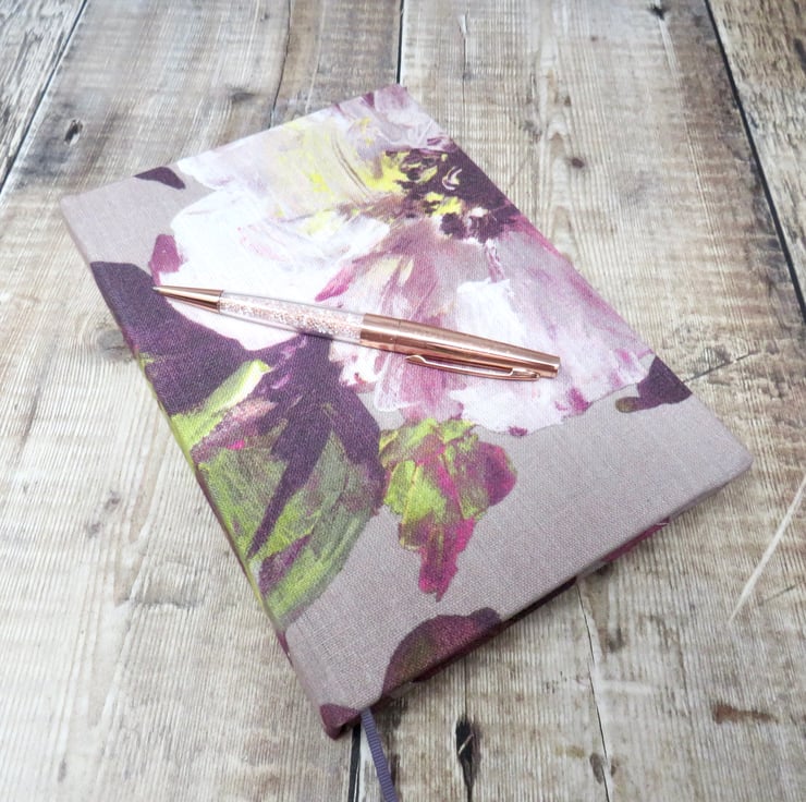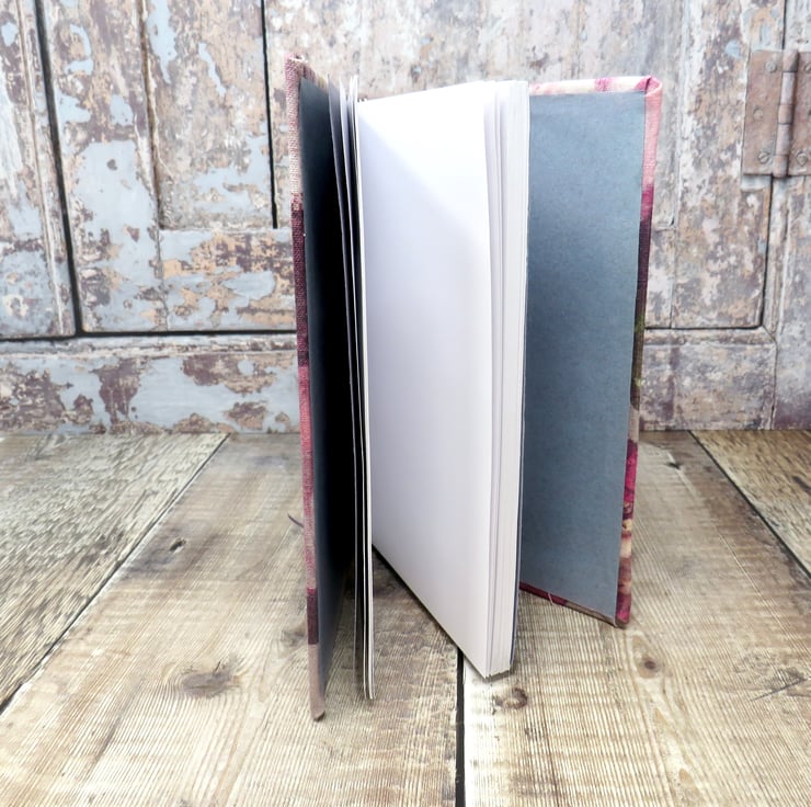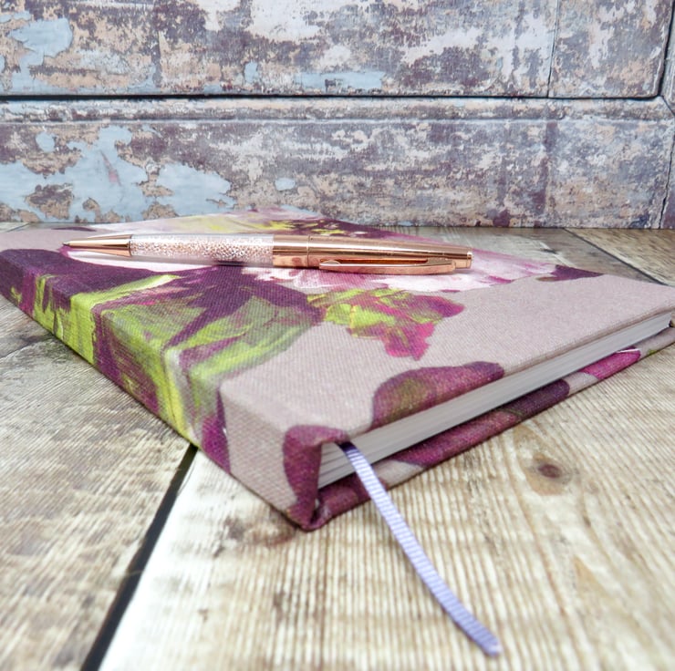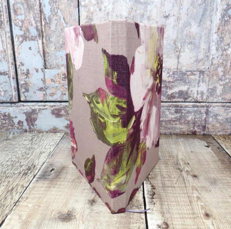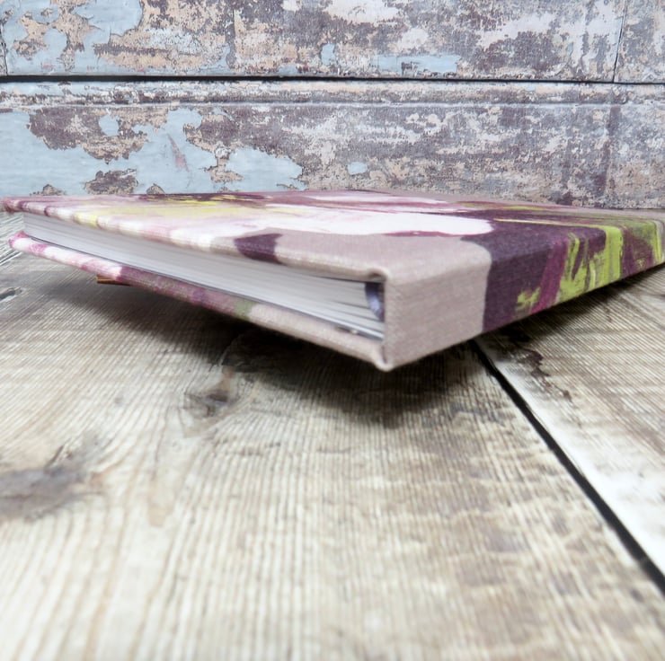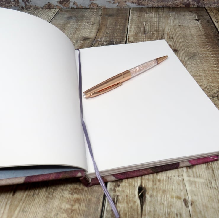 There are 48 pages - 96 sides of premium quality 140 gsm white cartridge paper, and the outer boards are covered in a lilac and purple floral heavy weight cotton. The book has lilac end papers, purple and white headbands, and a lilac ribbon bookmark.