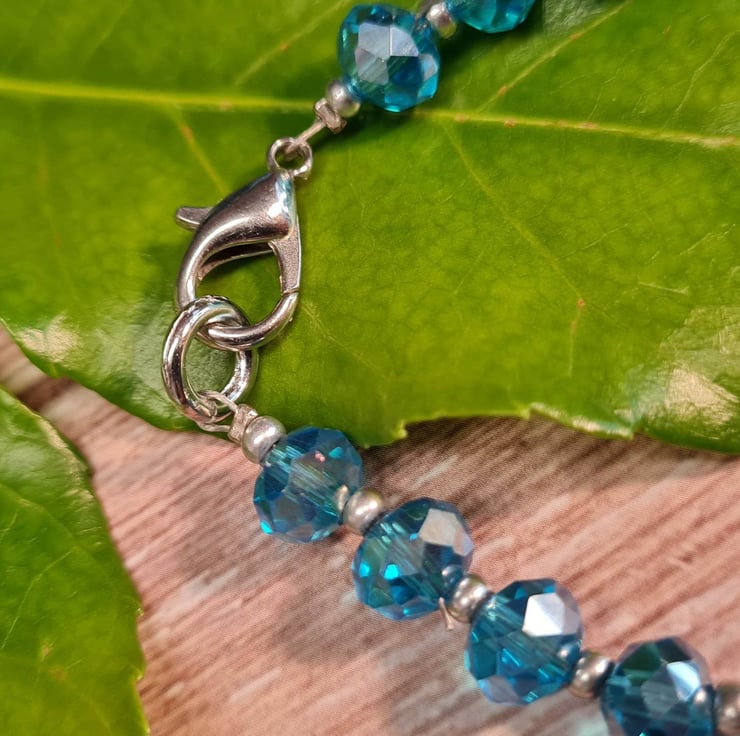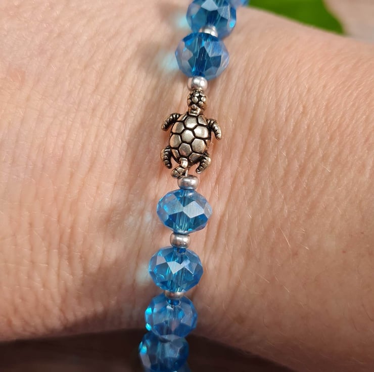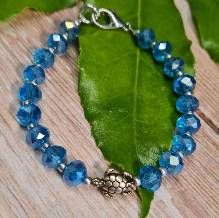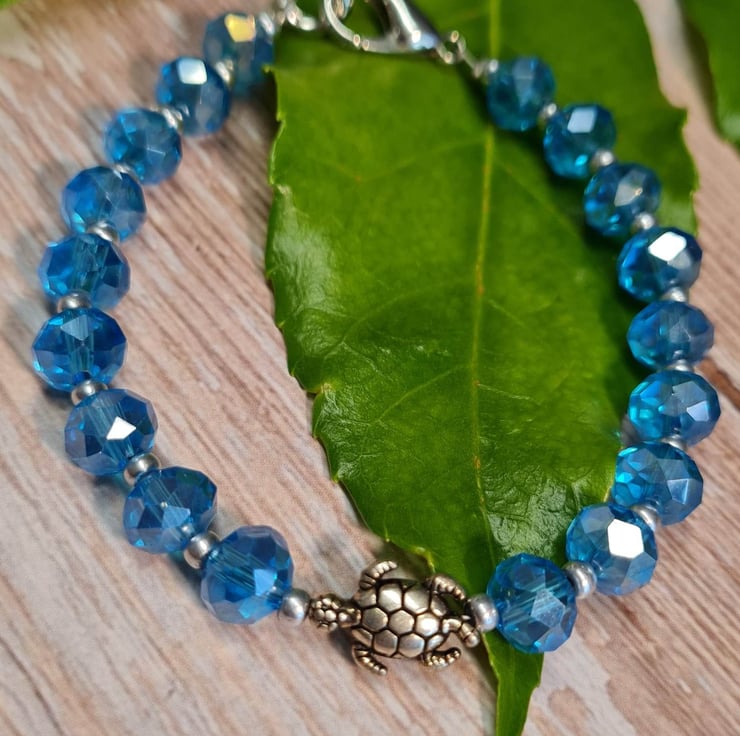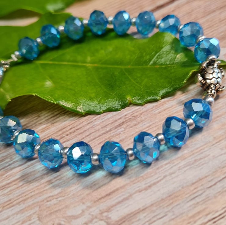 Handmade bracelet with turquoise blue crystals with an ab coat which means that they catch the light beautifully. There are Czech seed beads in between each crystal and an antique silver plated focal sea turtle bead.