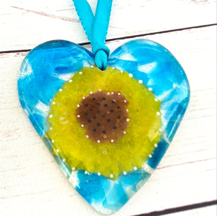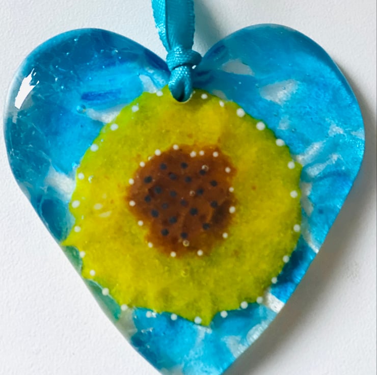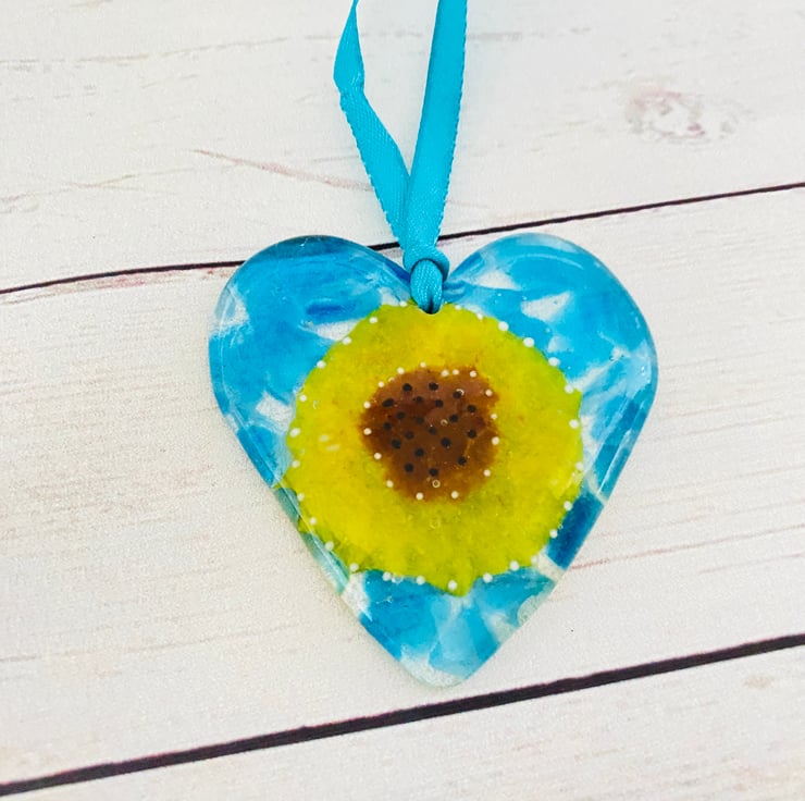 A pretty cast glass heart made from recycled art glass and encasing a sunflower . It was difficult not to be influenced by what is going on in Ukraine with this heart . The sunflower has become a symbol of hope for peace . A very pretty fused glass hanging heart which is approximately 3.5 inches diameter . Perfect to hang on the wall in your home or gift to a loved one . All of my cast hearts are one of a kind