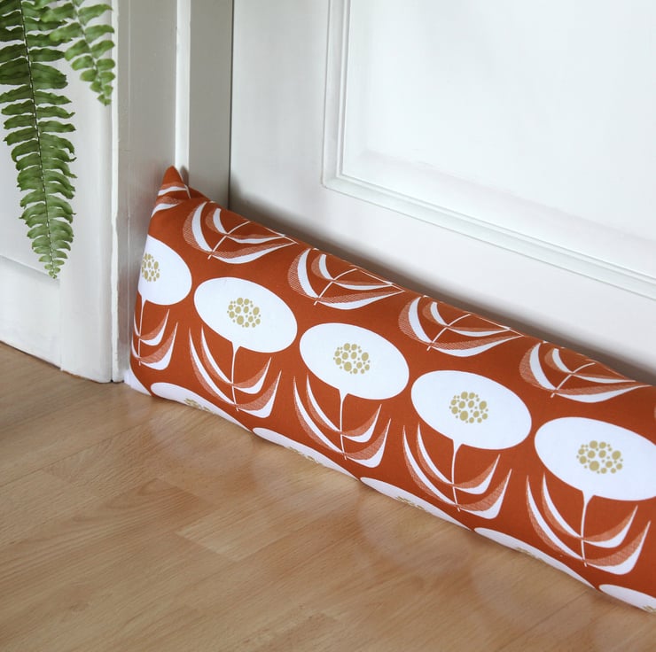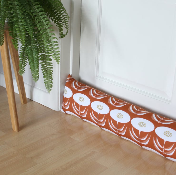 A colourful draught excluder in my Dandelion fabric in Burnt Orange..