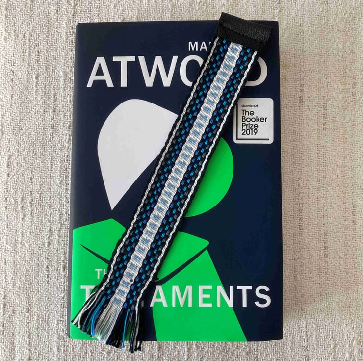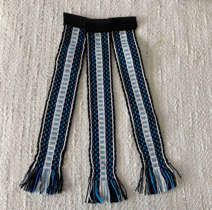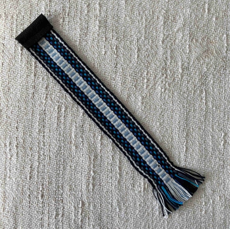 I weave many styles and types of narrow bands on different types of inkle and Sami band looms. Often I have small samples left over that are just too pretty to discard. A bookmark is a good way to recycle and to reduce waste. I make these bookmarks in a generous length, so that they should fit a hardcover book.