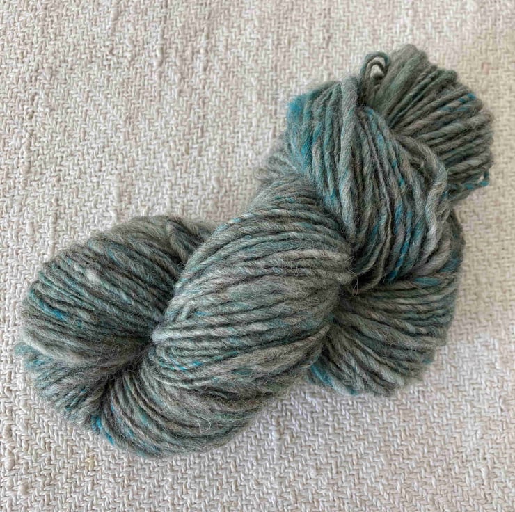 This listing is for one skein of Paivatar SISU hand spun using a blend of fine quality natural wool fibres (Blue Faced Leicester, Finn, and Corriedale). The base for this yarn is a blend of natural grey and white wools, speckled with turquoise, and blue wools.