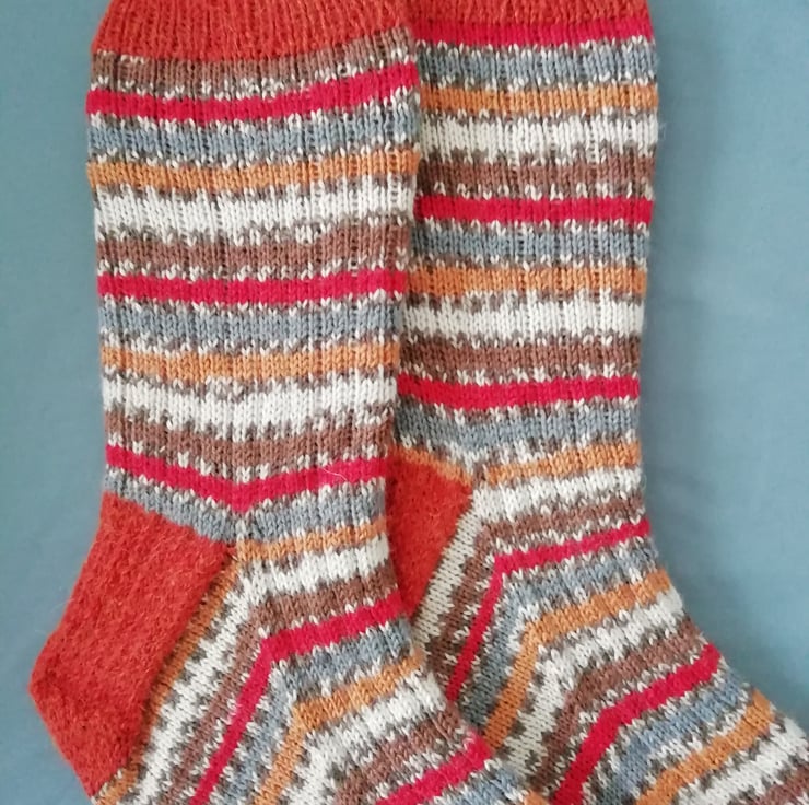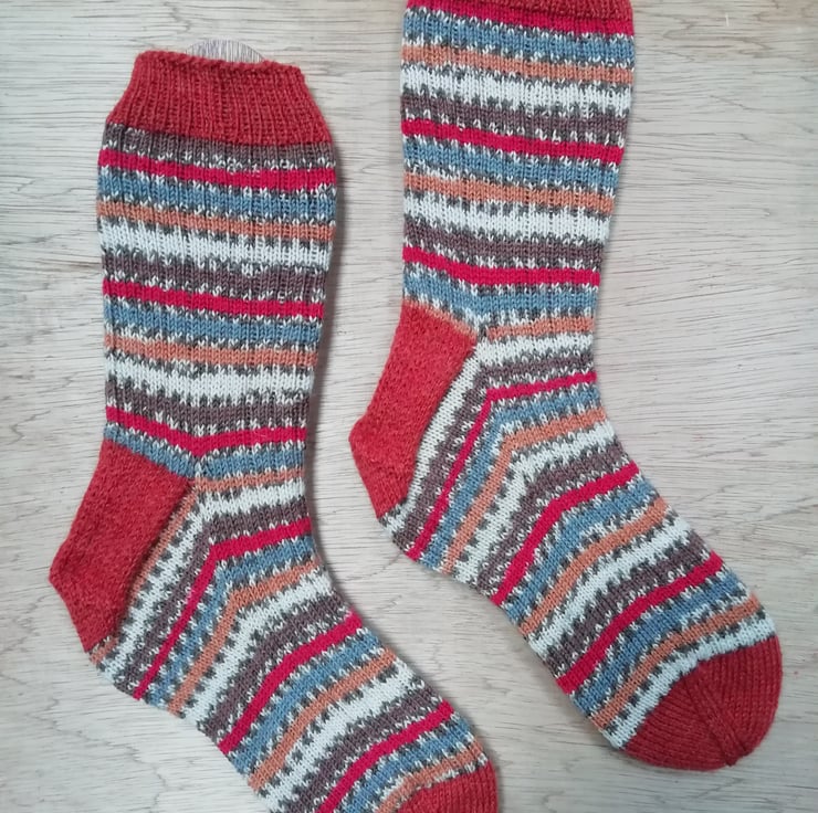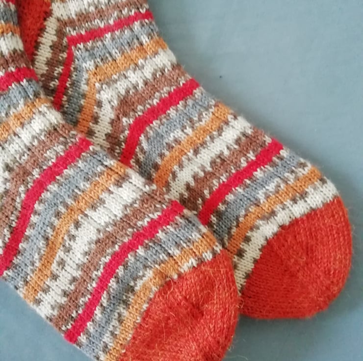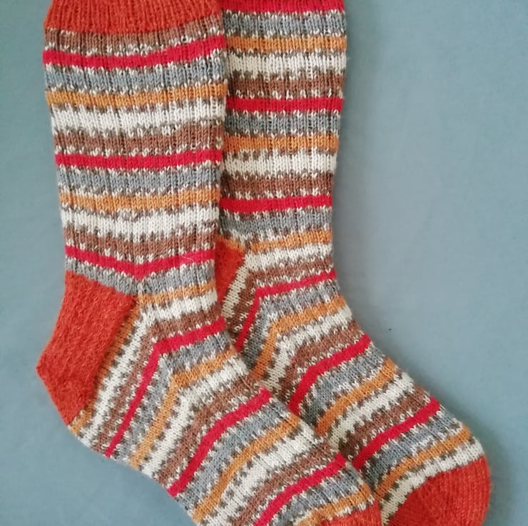 These socks are hand knitted using traditional methods on five double pointed needles. They are made using a durable and comfortable 4 ply yarn comprising of 75% superwash wool and 25% polyamide ensuring comfort and strength. The yarn is a British wool and has been dyed using colours inspired by robins. I have used a contrasting rust coloured alpaca yarn for the tops, toes and heels.