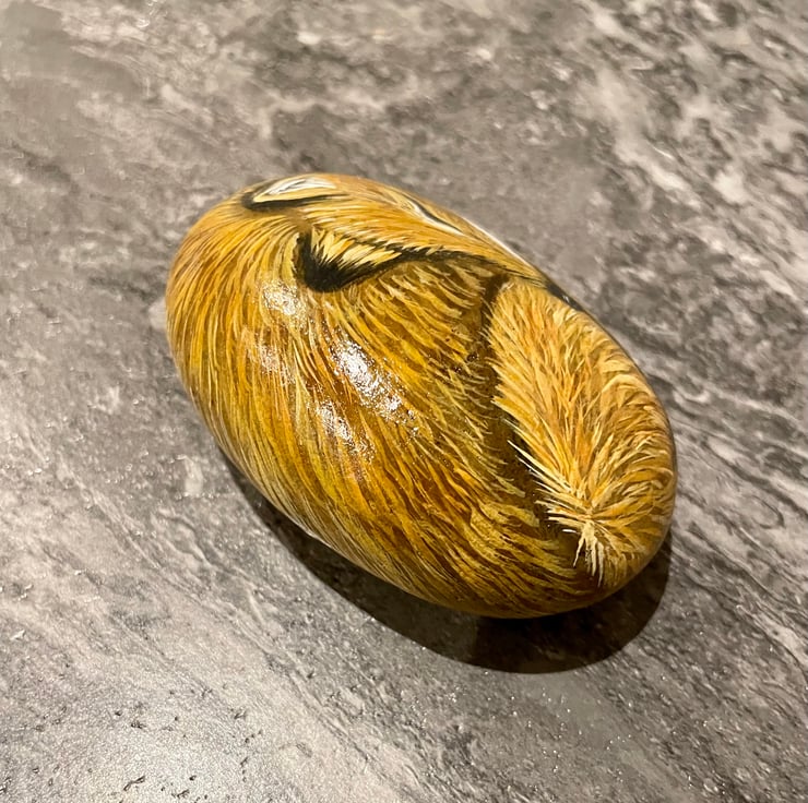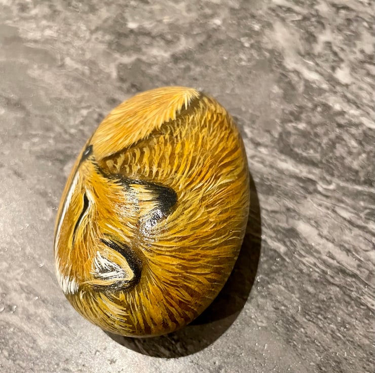 This fox has been painted by myself onto a smooth stone and glazed for a glossy protective finish