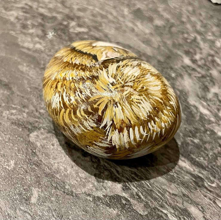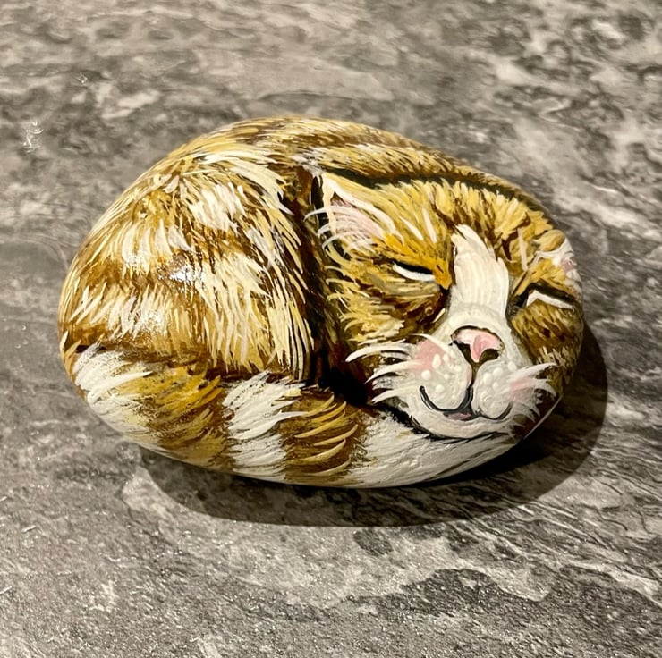 This sleeping cat has been painted onto a smooth stone and glazed for a glossy protective finish