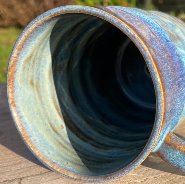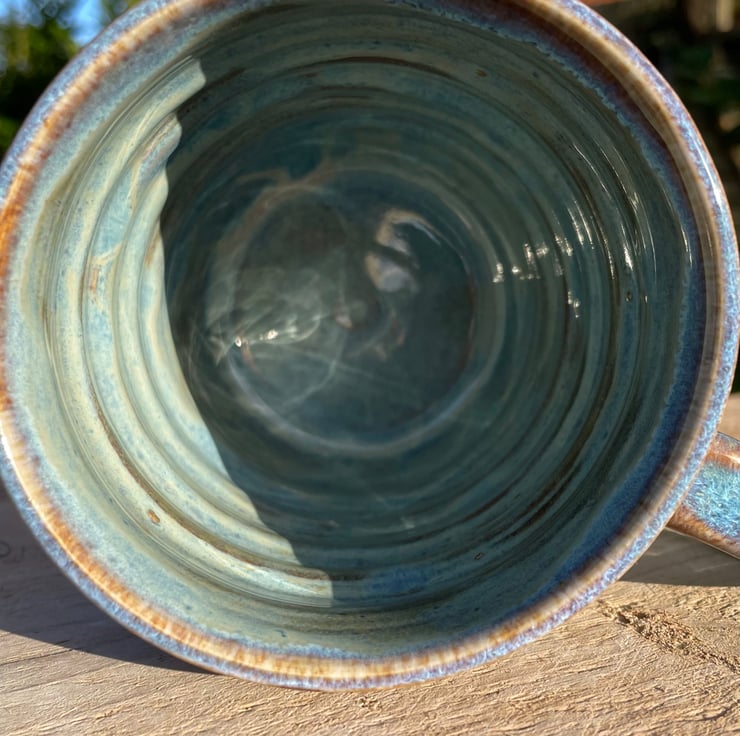 Made with stoneware clay and thrown on the wheel. It features a swirl that is added as the wheel rotates slowly and the swirl is raised from the base to the top. It also means if you’re a mug hugger, that it sits beautifully in the hand.