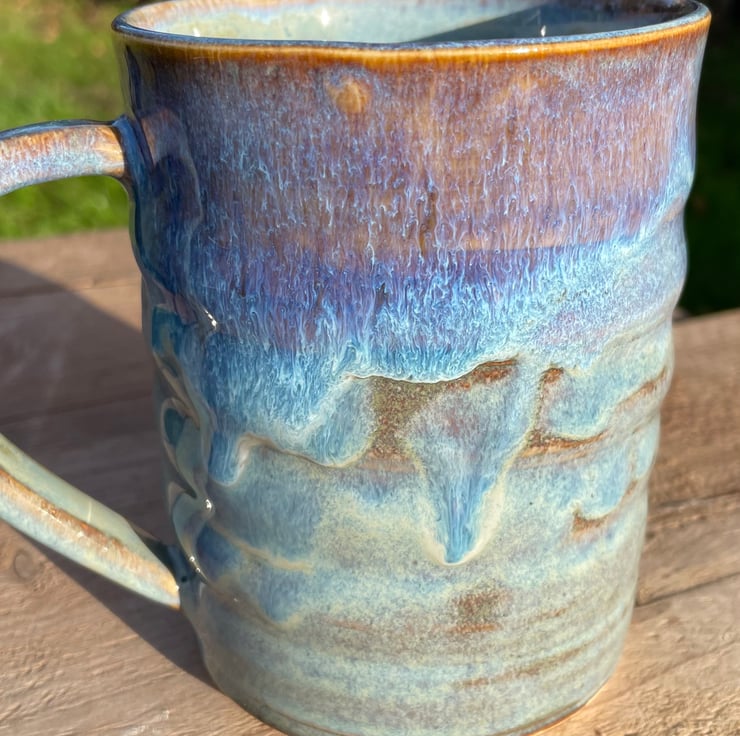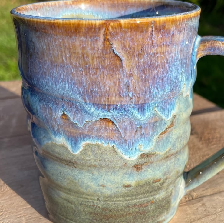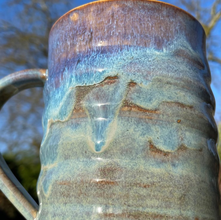 The mug was dried slowly once the handles were added over a few weeks. It was then fired to over 1000c, called a bisque firing. It was then glazed and fired again to over 1200c. This is when the magic happens and the glazes run into each making the individual look of the Made With Mud mug.