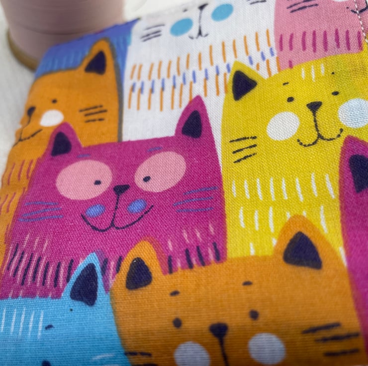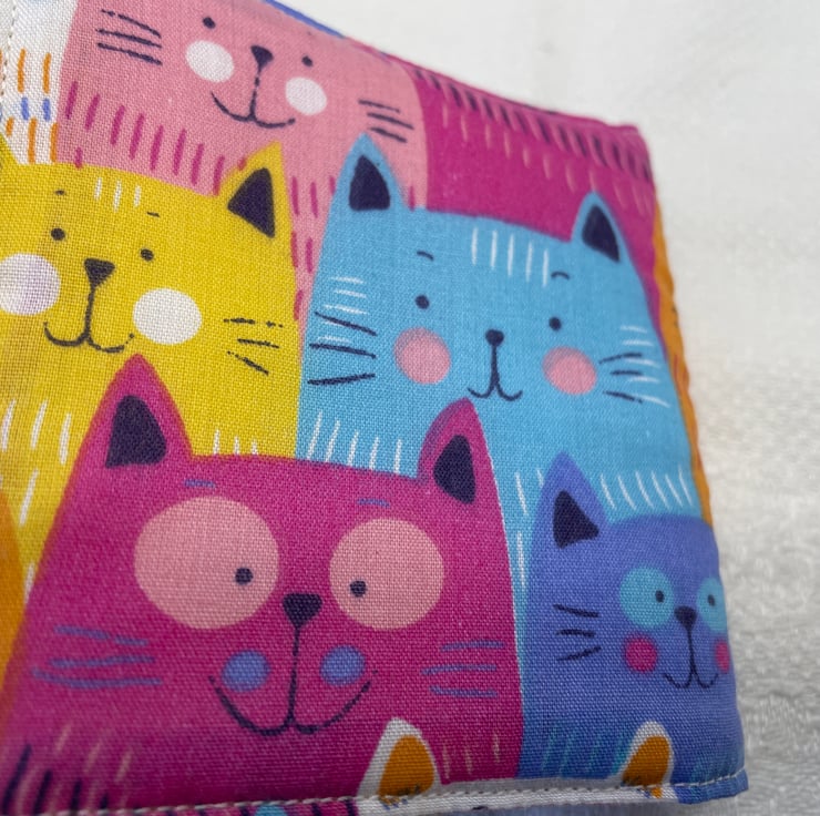 Fabric is bright multicoloured happy cats lined with the same.