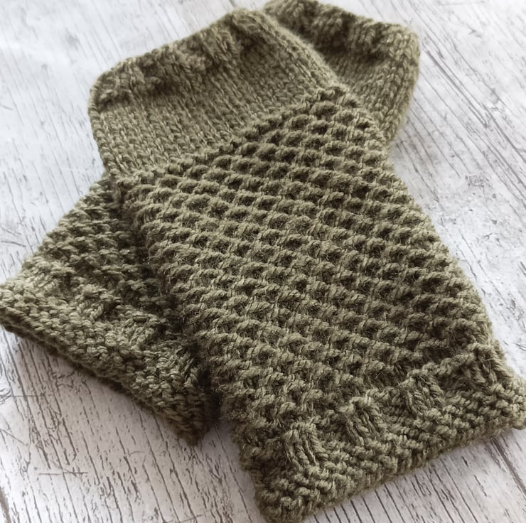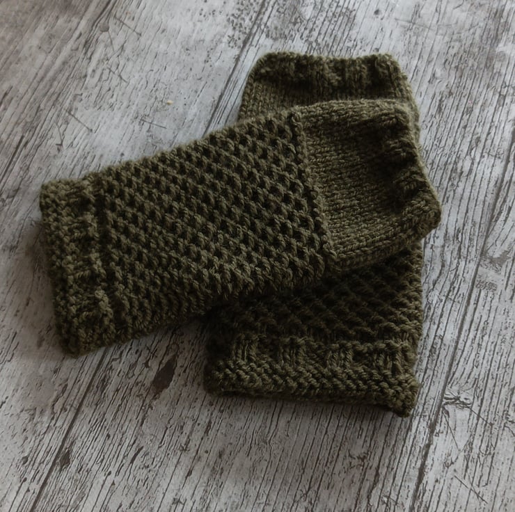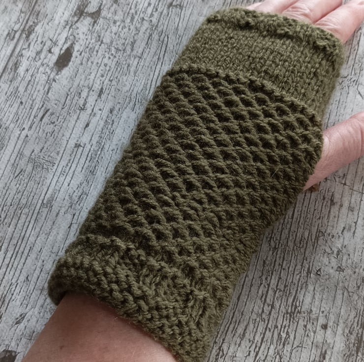 Hand-knitted khaki fingerless gloves in 100% acrylic in khaki. New design. Fits small/medium sized hands.