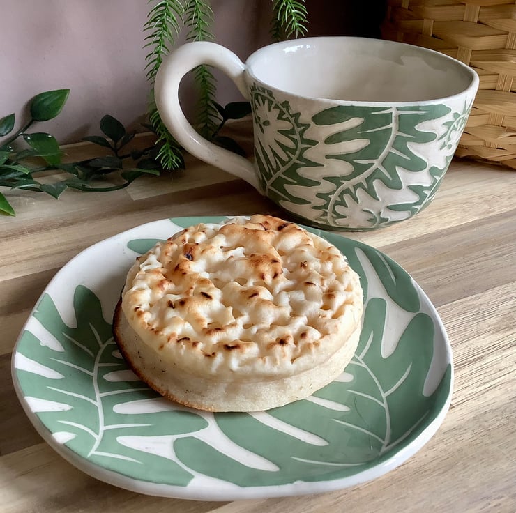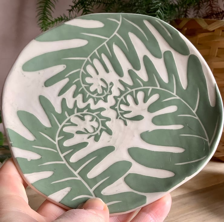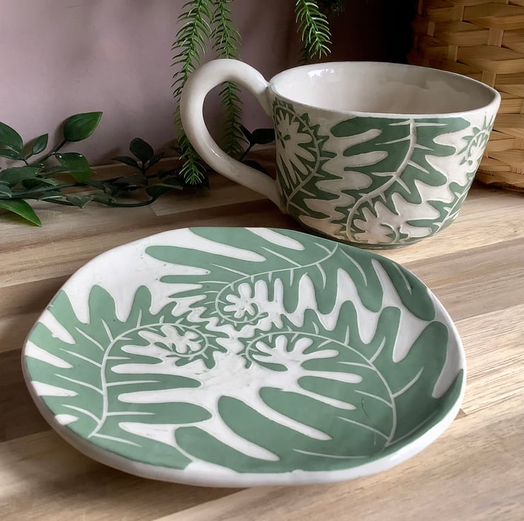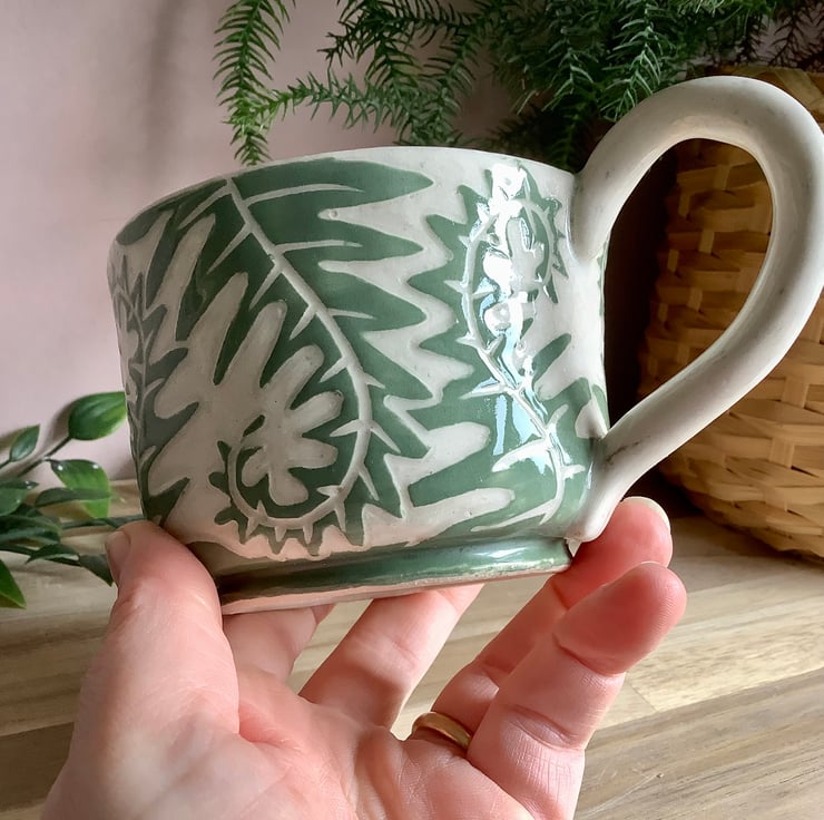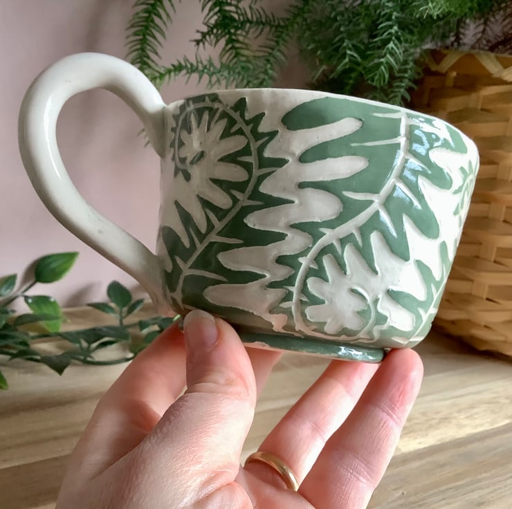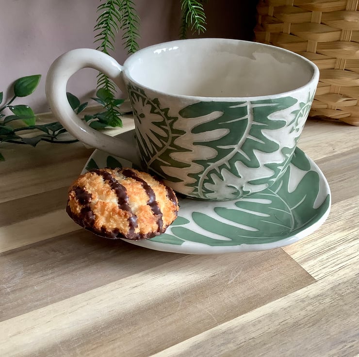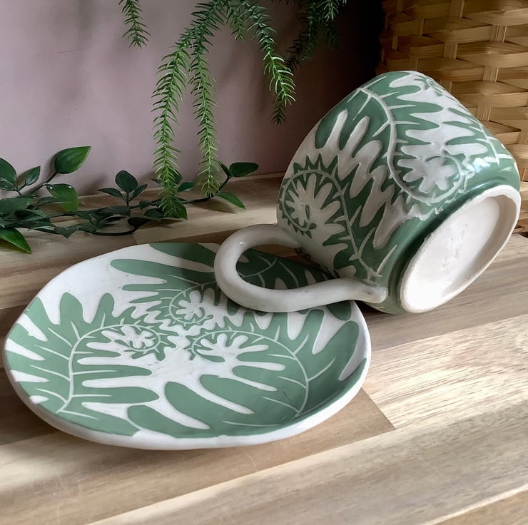 This lovely sgraffito mug measures approximately 11cm x 7cm and hold 350ml of liquid. The matching saucer/side plate measures approximately 15cm across. It is made of stoneware so is very robust and can be used in the microwave, oven, dishwasher and is also frost proof. The design is carved into layers of coloured slip that are applied when nearly dry. Each piece is unique with its own individual quirk’s. Makes a great gift and can be used along side my coasters and small dishes.