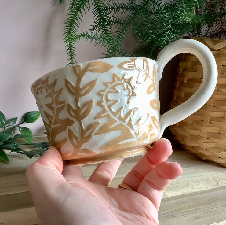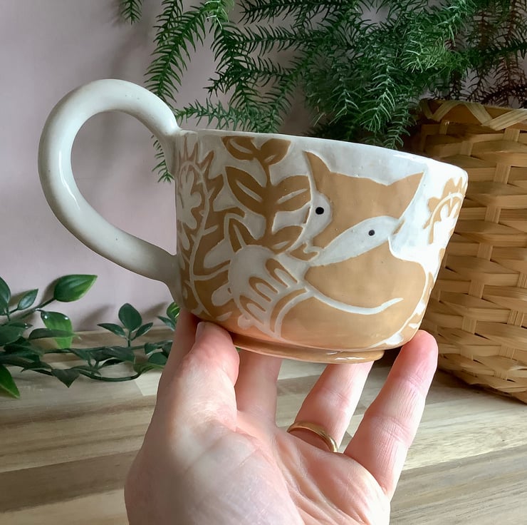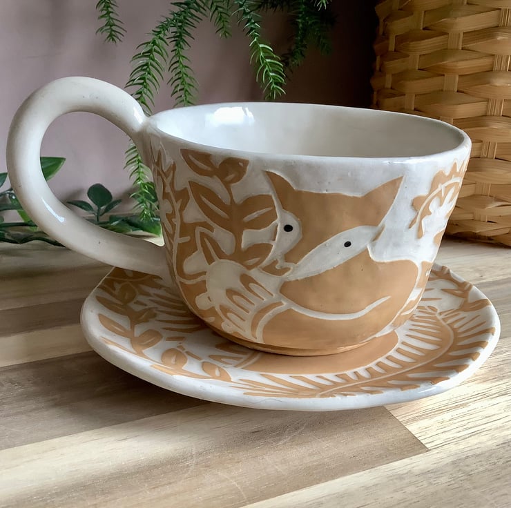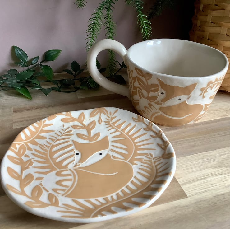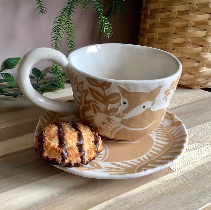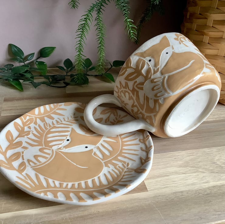 This lovely sgraffito mug measures approximately 11cm x 7cm and hold 350ml of liquid. The matching saucer/side plate measures approximately 15cm across. It is made of stoneware so is very robust and can be used in the microwave, oven, dishwasher and is also frost proof. The design is carved into layers of coloured slip that are applied when nearly dry. Each piece is unique with its own individual quirk’s. Makes a great gift and can be used along side my coasters and small dishes.