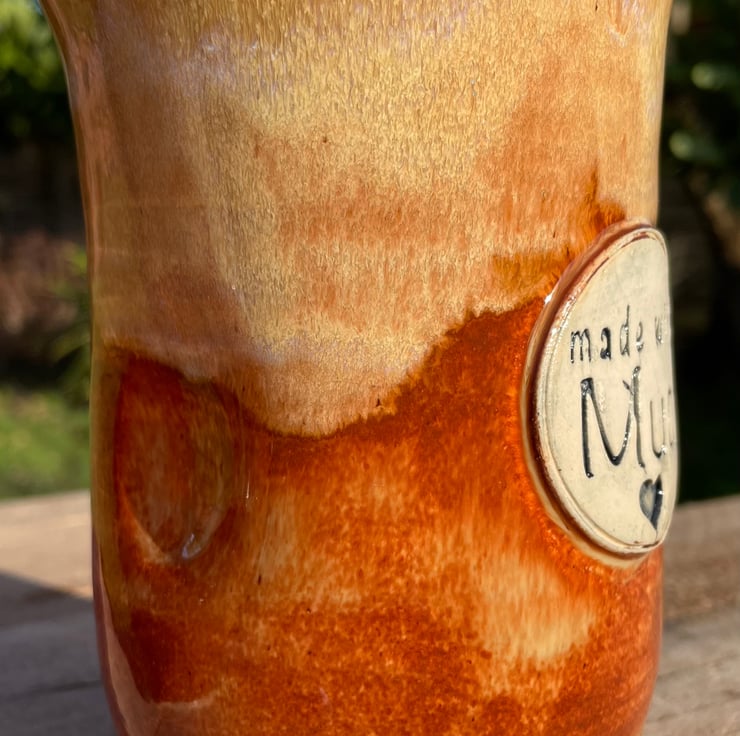 The mug was dried slowly once the handle was added, over a few weeks. It was then fired to over 1000°c in a bisque firing. It was then glazed and fired again over 1200°c.