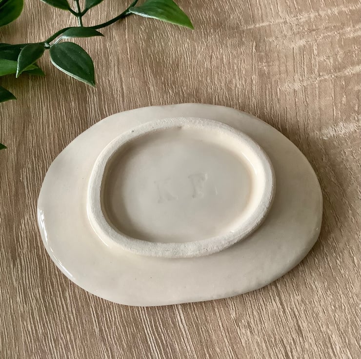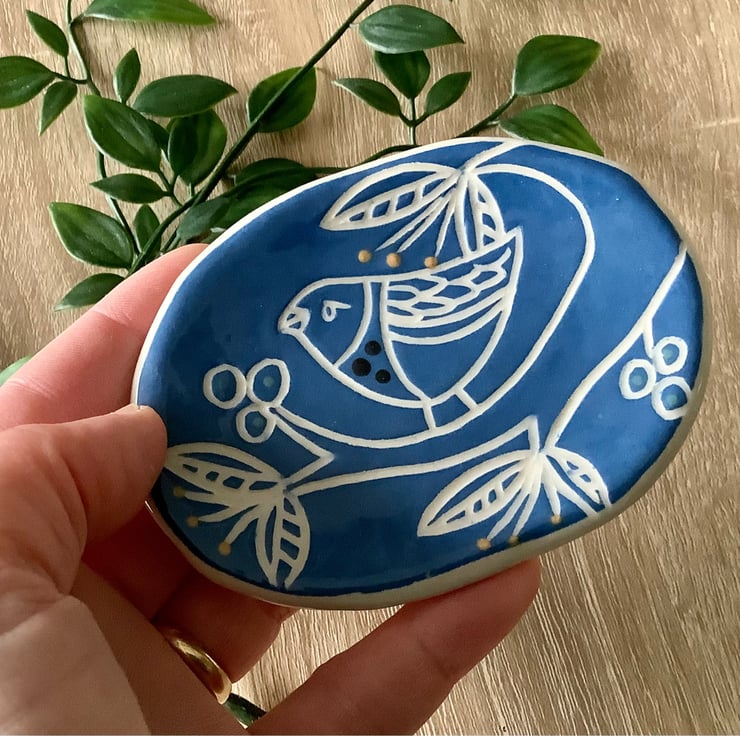 Handmade stoneware dish, measuring approximately 8cm. Slightly dish shaped with foot ring. Decorated using the sgraffito technique, where the design is carved into layers of coloured slip. I then finish with small dots of contrasting colours. Each is unique thanks to the hand carving technique. Dishwasher and frost proof, made for everyday use.
