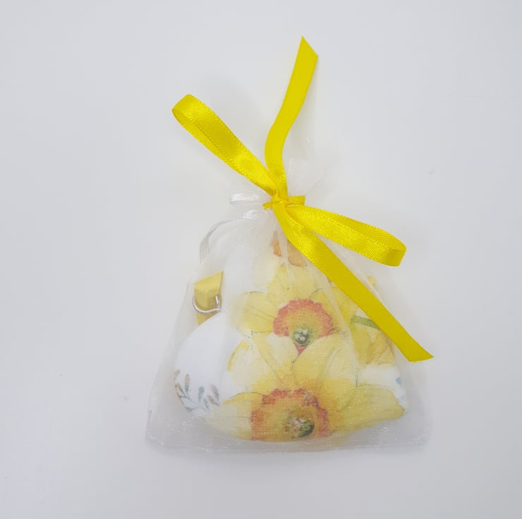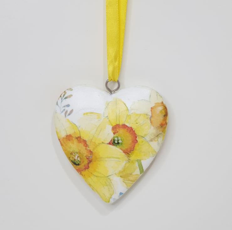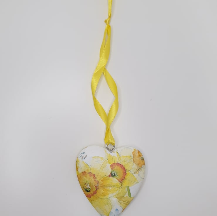 Pretty daffodils decorated wooden heart hanging decoration which has been painted white and decoupaged, sealed and finished with yellow satin ribbon ribbon. This chunky heart has been decoupaged on both sides and would look lovely hung in a window or make a pretty addition to your Spring decor hung from a handle, piece of furniture or mantlepiece.