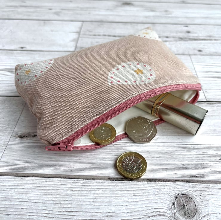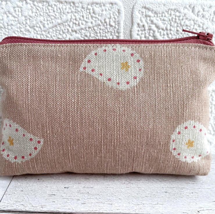 Large coin purse in pink with abstract teardrop pattern. This pretty, large-sized purse is made from pale dusky pink fabric with a print pattern featuring cream abstract teardrop shapes. Each teardrop shape has a tiny golden yellow flower at one end, and a border of darker pink dots around its inner edges. The purse has a dusky pink zip, which matches the dots, and is lined with cream fabric. The base of the purse is squared off to give extra room inside.