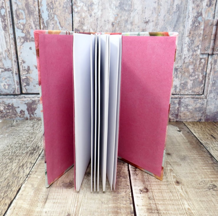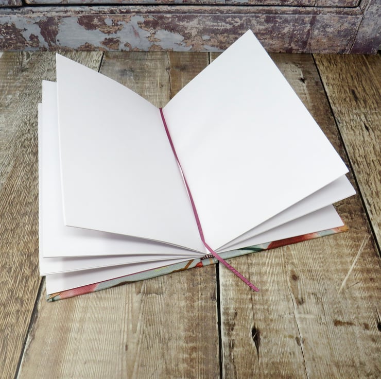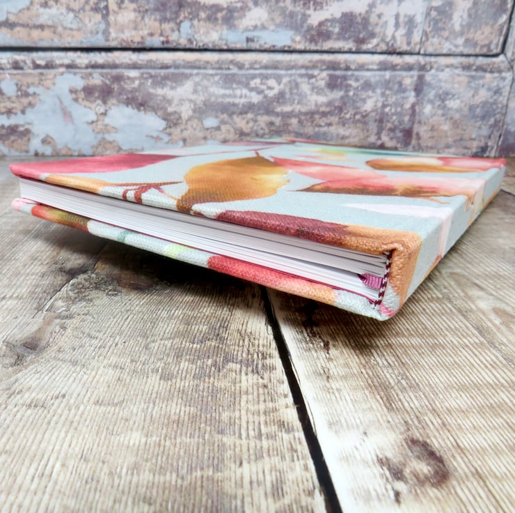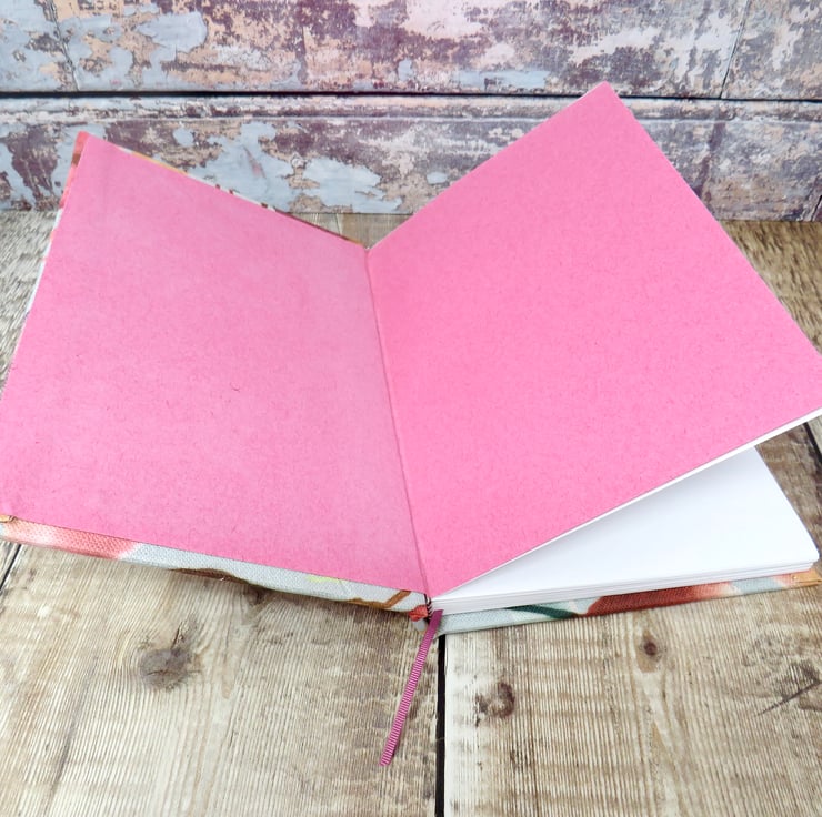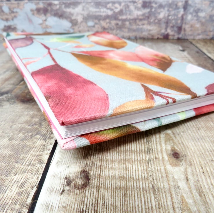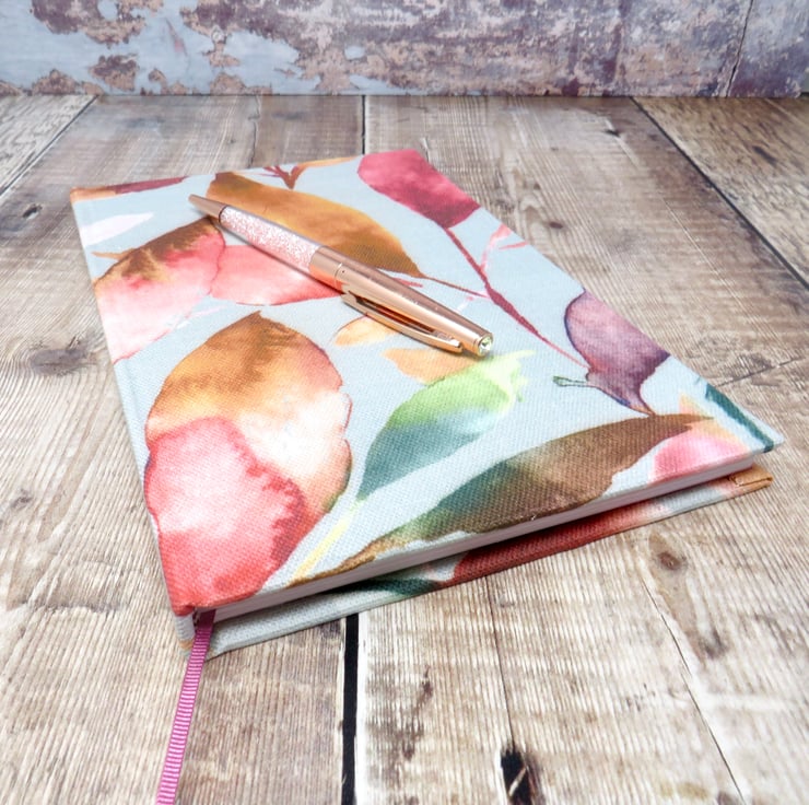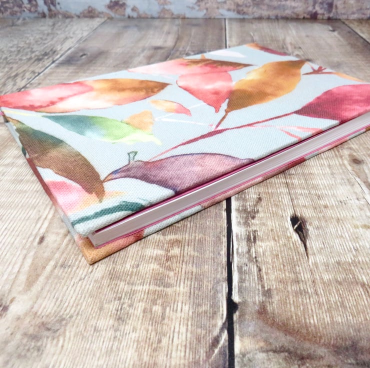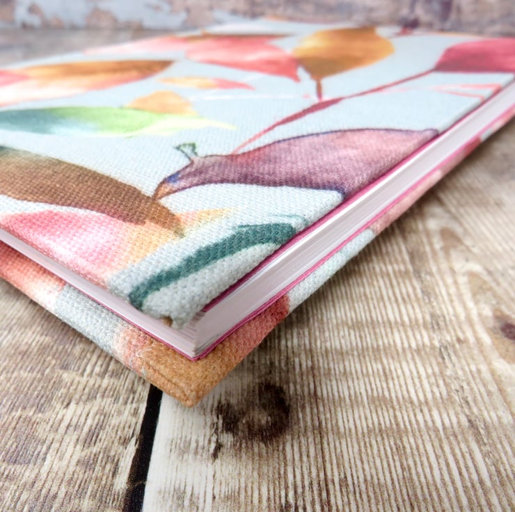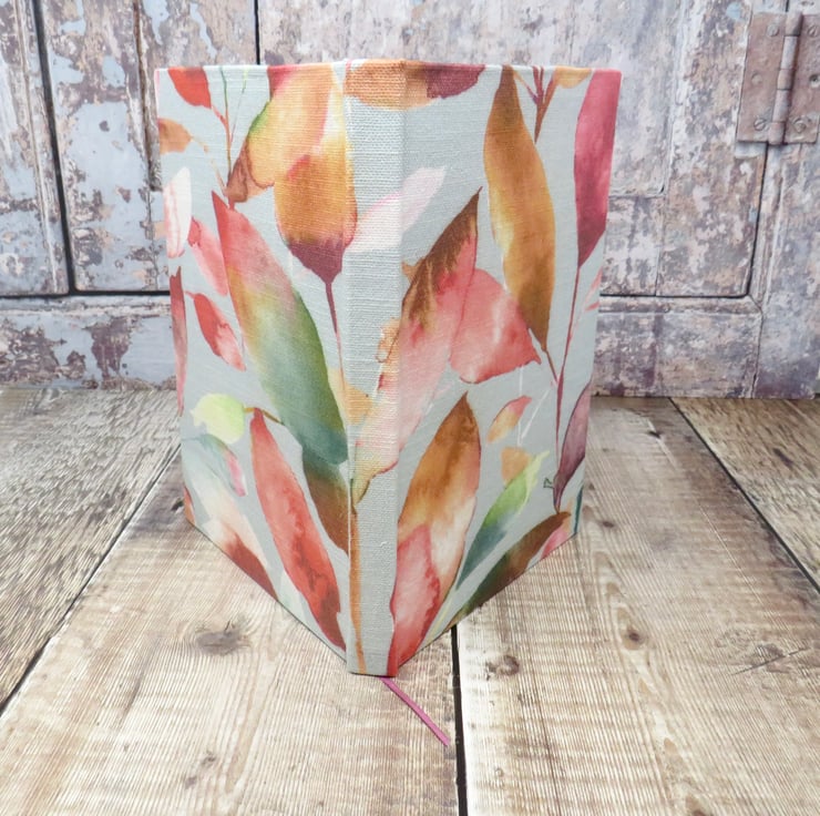 A completely handmade A5 notebook, constructed from scratch in the traditional way. It has 48 pages - 96 sides of white 140gsm premium quality cartridge paper, with the outer boards covered in a thick cotton fabric with a fresh leaf print in autumn colours. It has pink end papers and a ribbon bookmark.Perfect for journalling or sketching.