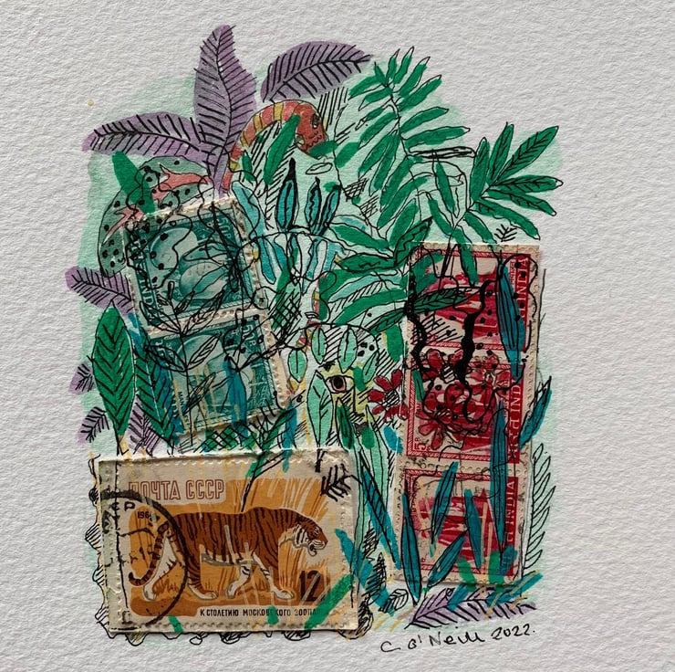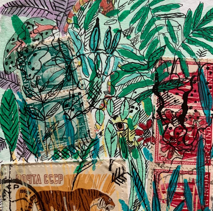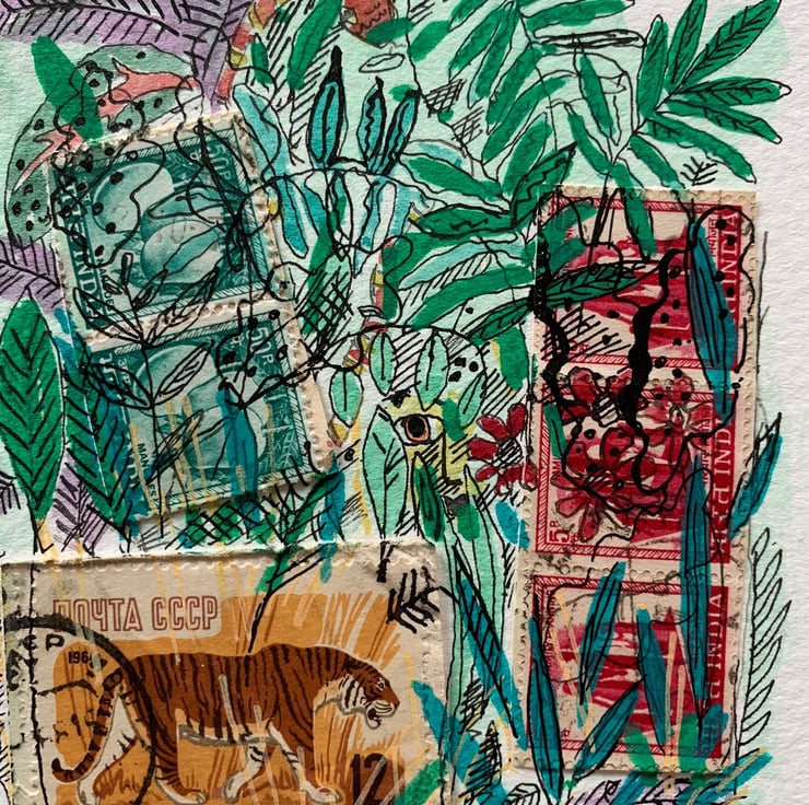 The starting point and inspiration for this little picture was the beautiful tiger stamp. He looks very grand walking through lush greenery. I recently acquired this box of stamps and happily rummaged through the box and now and again coming across a little gem.