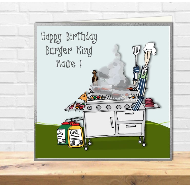 Do you know a bloke who is a BBQ king? Then this card will suit him perfectly as king of the burger and personalised with his name to prove it.