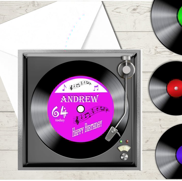 Personalised Vinyl Record on turntable birthday card with magenta label where you can add a name, age and greeting in the insert.