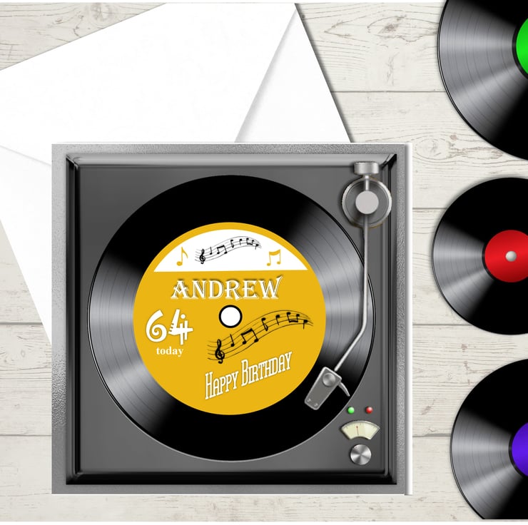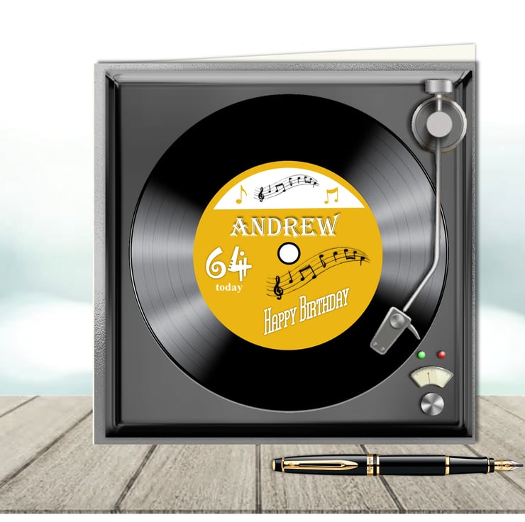 Personalised Vinyl Record on turntable birthday card with gold label where you can add a name, age and greeting in the insert.
