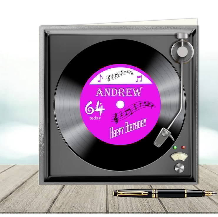 Personalised Vinyl Record on turntable birthday card with magenta label where you can add a name, age and greeting in the insert.