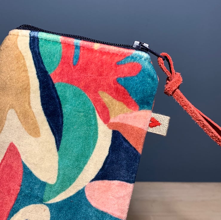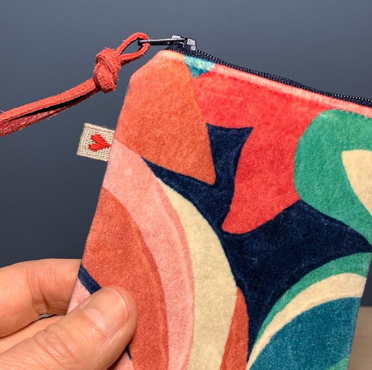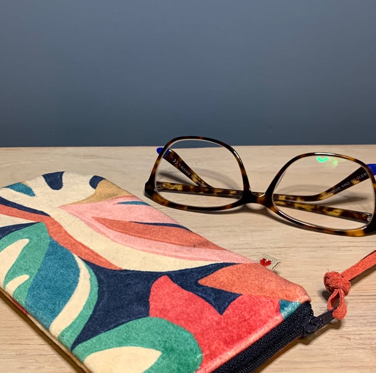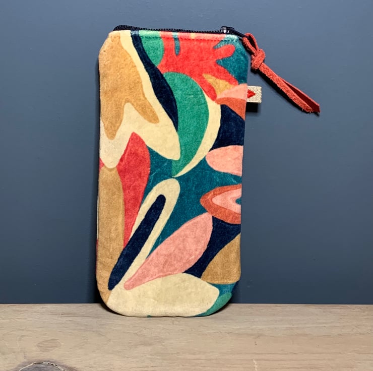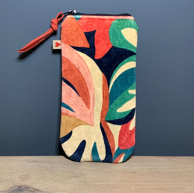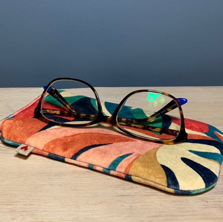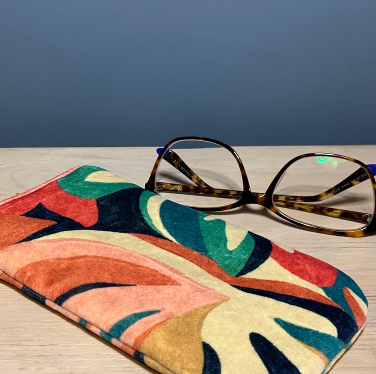 Pretty cotton velvet zip pouch just the right size for glasses made from melora cotton-rich velvet. There is a layer of interfacing to give some protection to the contents and the pouch is lined with soft brushed fabric.