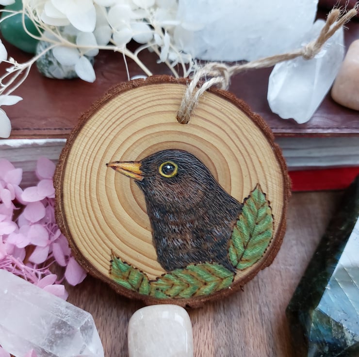 Blackbirds sing one of my favourite songs and I always enjoy seeing them about the garden. This cute little blackbird is created using pyrography, burning on wood, which I colour with inks and coloured pencils. A coat of linseed oil helps to preserve the piece. Each piece is unique being drawn directly on the wood.