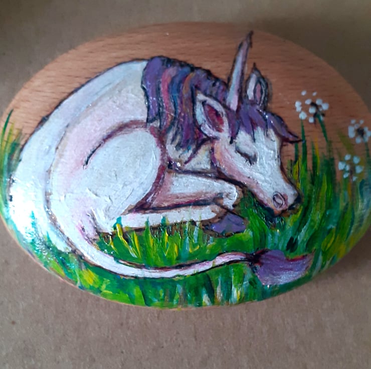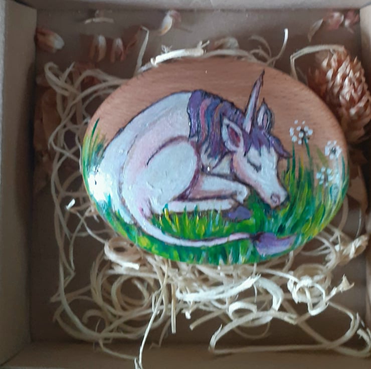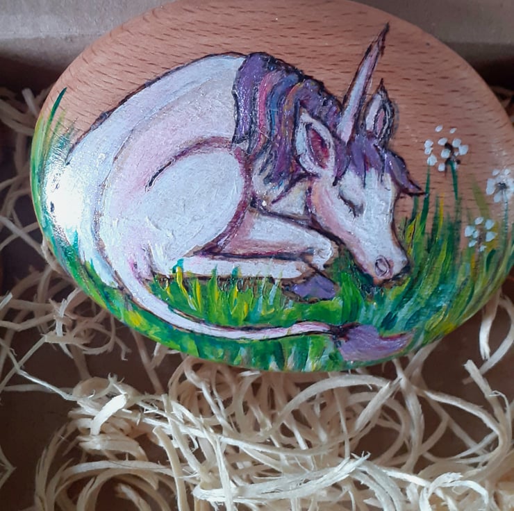 This little unicorn is handpainted and handburned onto an 8cm wide wooden pebble.