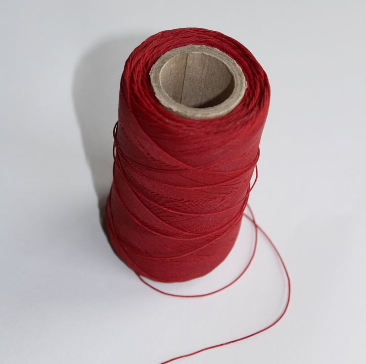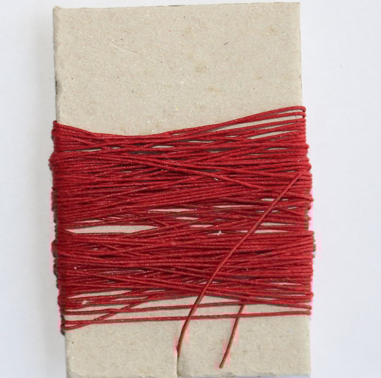 50m red bookbinding thread wound onto card. note : this is more of a burgundy , not a bright red.