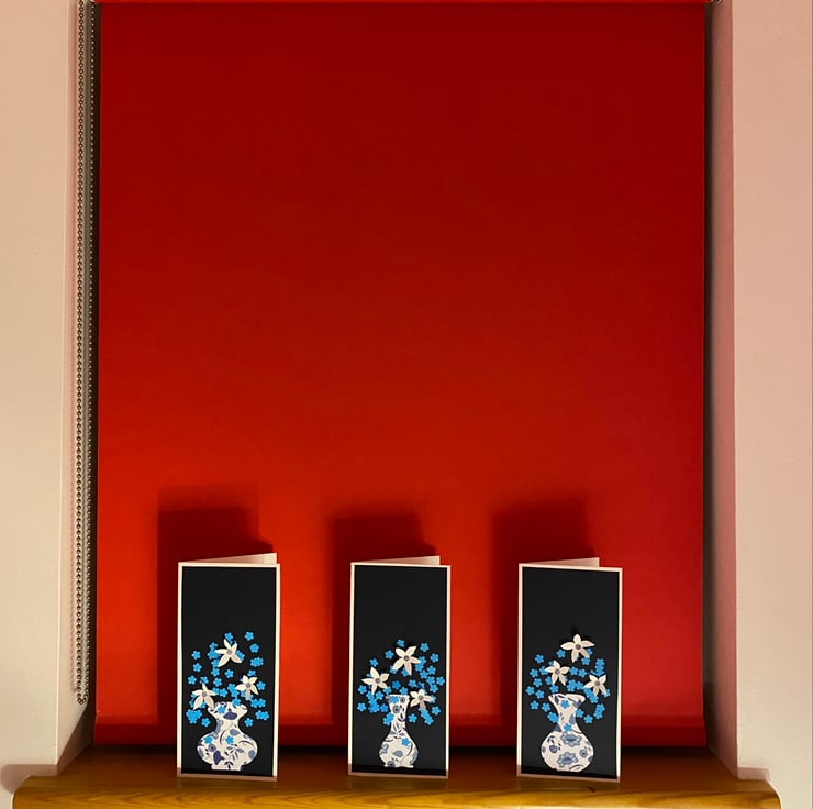 Paper sculpture vase of flowers in shades of blue. 210mm high and 95mm wide with white laid paper lining to add your own message.