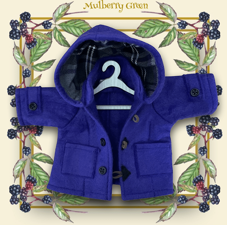 A lovely little purple duffle coat with a tartan lined hood to fit the Mulberry Green dolls. The coat has a hood, two little pockets, sleeve tabs decorated with buttons and leather loop button fastenings.