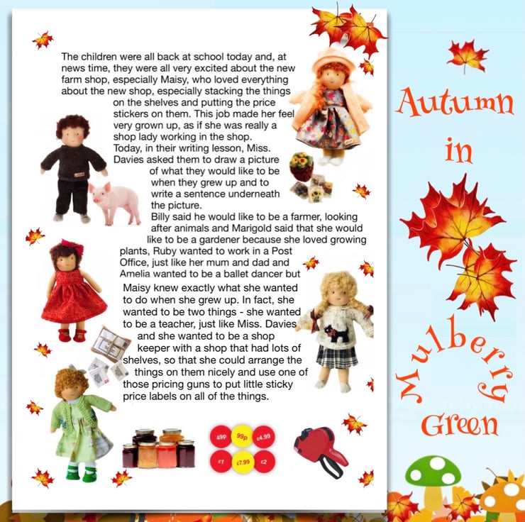 There are other children in Maisy’s class at school - Violet, Billy with his pet rabbit, Amber, Tilly, Rosie and her kittens, Amelia, Ruby, Marigold, Bobby with Max the dog, and the twins Oliver and Olivia, who have a puppy called Oscar. The dolls are all 26cm tall and baby Daisy is 16cm. Maisy and Mo love nothing more than having adventures with their friends. You can read about their adventures on my Facebook and Instagram pages - Maisy Muffin Rag Dolls and on my Mulberry Green Pinterest boards.