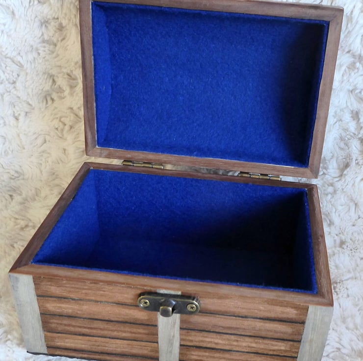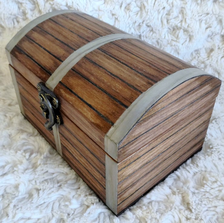 Decorated with real wood veneer using dark and coloured woods with a treasure chest design.