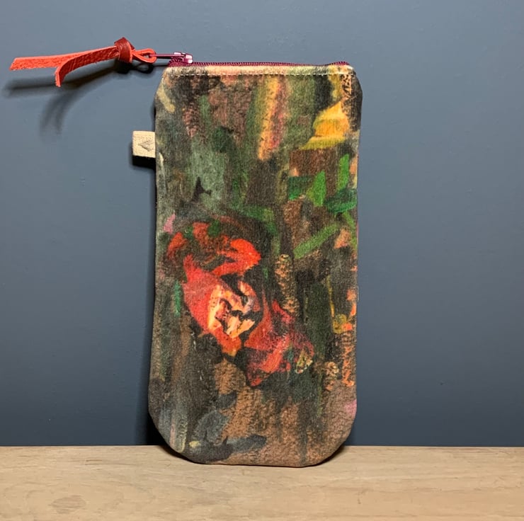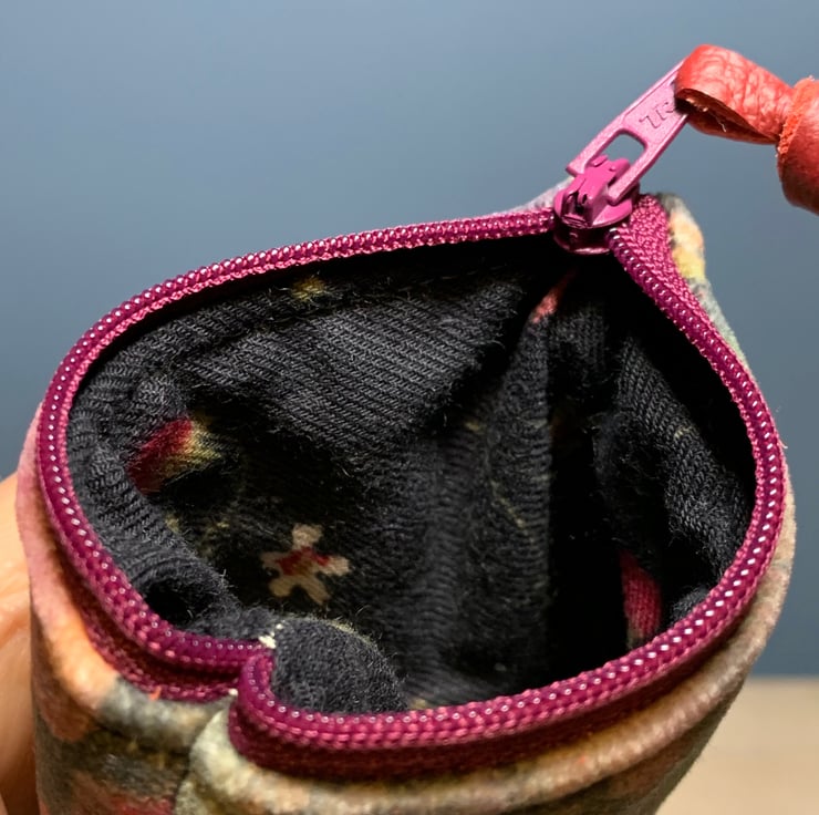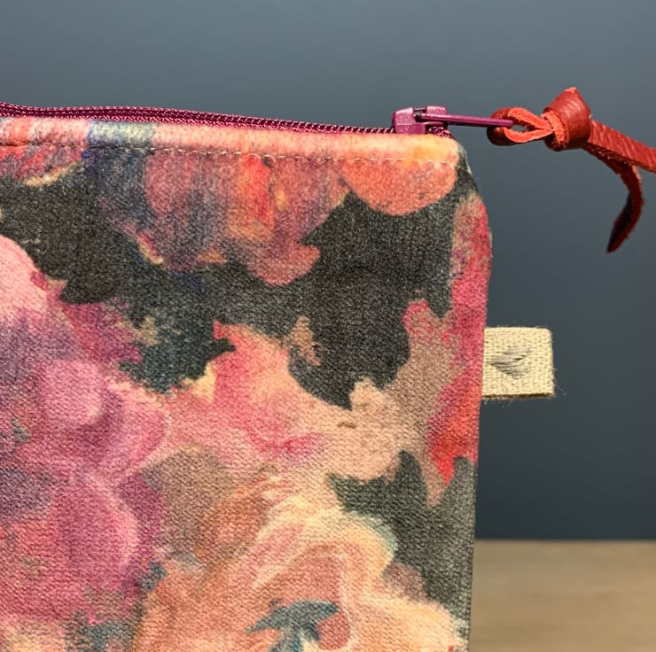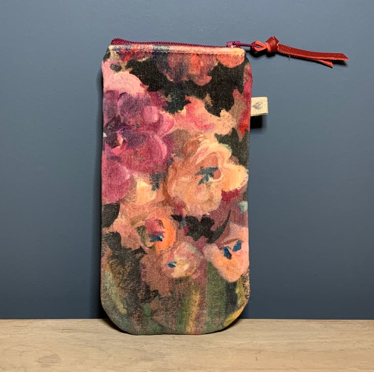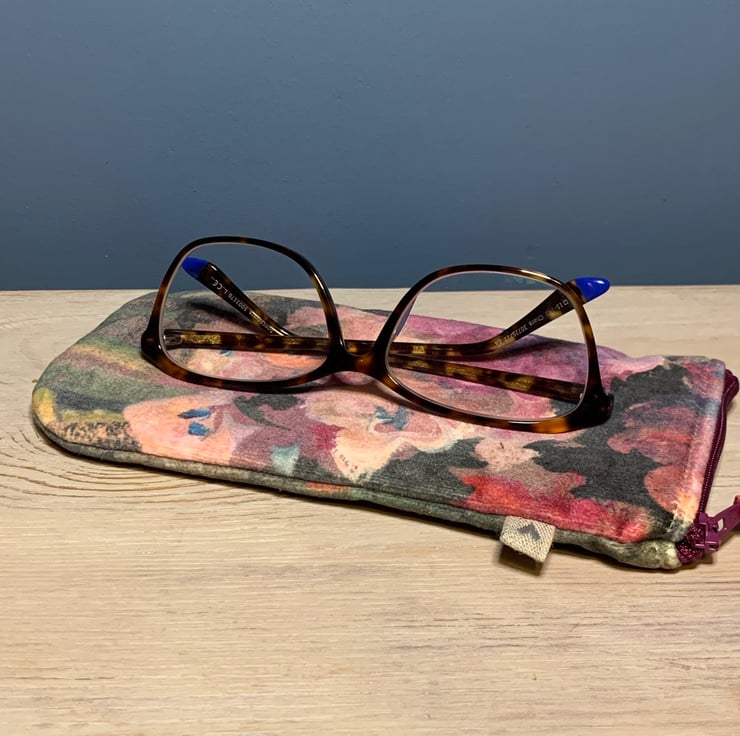Pretty floral velvet glasses case with zip fastening. There is a layer of interfacing to give some protection to the contents and the case is lined with floral brushed cotton.