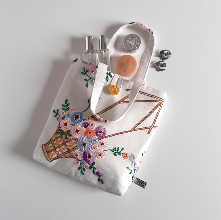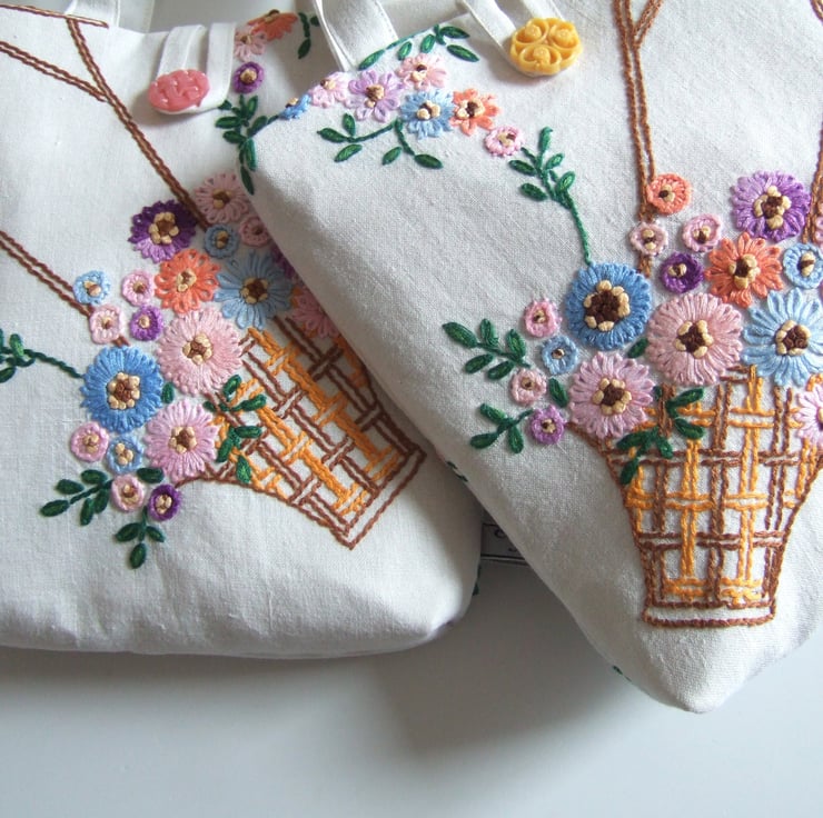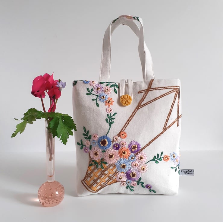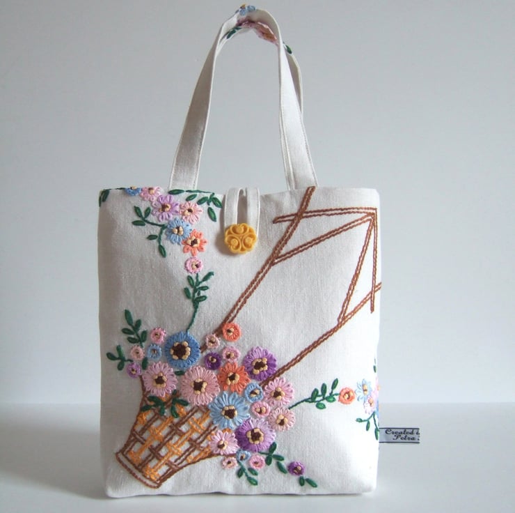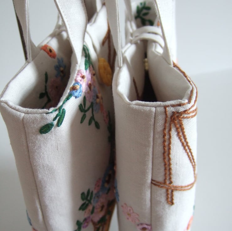 This lovely vintage embroidered table linen was just large enough to make a pair of my little bucket bags. This one has a huge basket of embroidered flowers sweeping across the front, and a little sprig of vintage flowers across the back. Its two handles are long enough to fit snuggly around your hands, and although it is dinky, it is just large enough to hold your essentials at a wedding or garden party. These small hand bags have a decorative button and loop fastening, as well as a magnetic snap on the inside facing, and are like having an additional pocket, but with its own handles! Great little Springtime handbags, or as a treat for yourself.