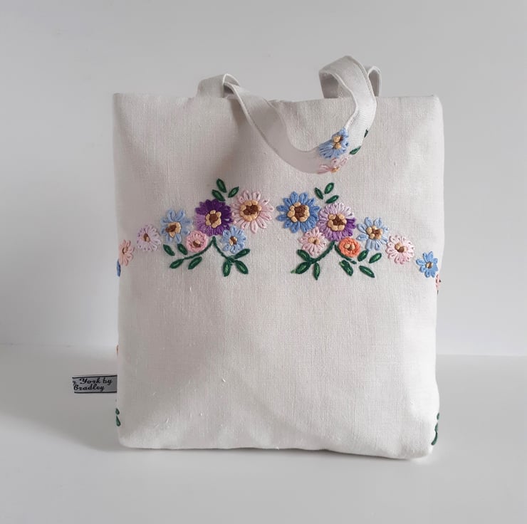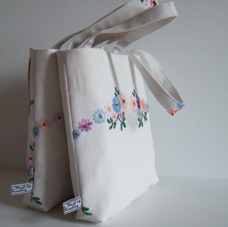 The linen has been stitched onto canvas to strengthen it, but it is still a soft little bag. It has a pair of handles, each 30 cm long.