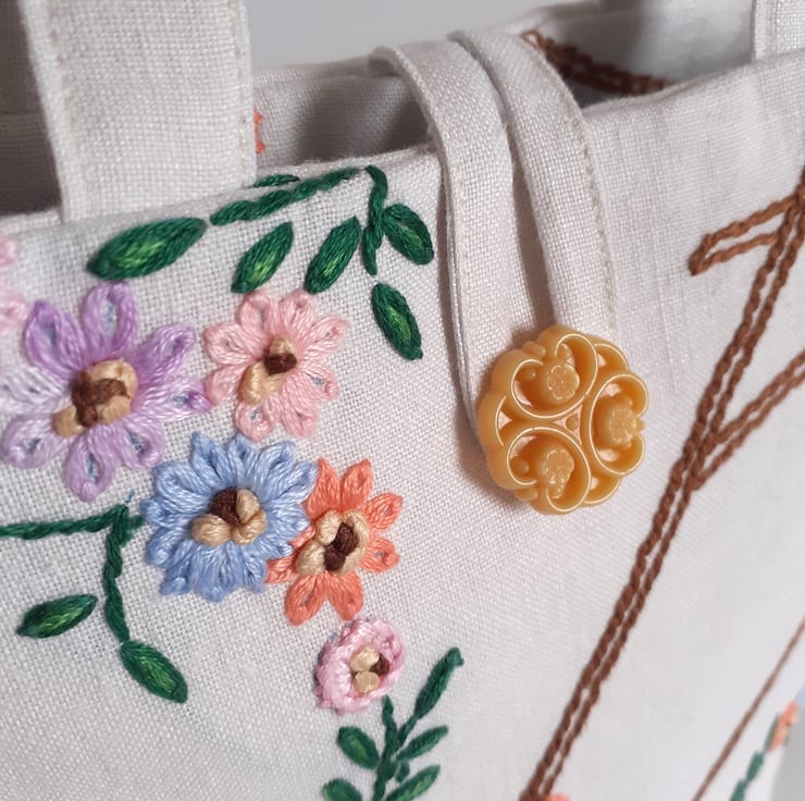 It fastens with a magnetic clasp, as well as with a decorative yellow vintage button and loop closure. It is finished off with my own embroidered name tag.