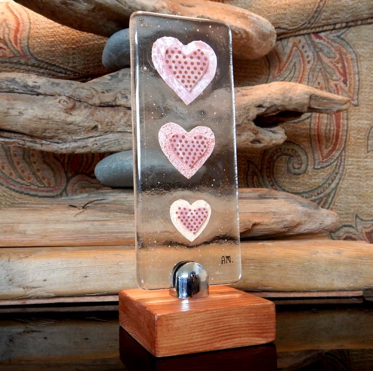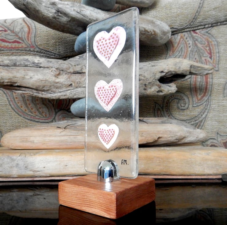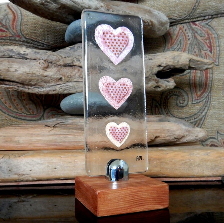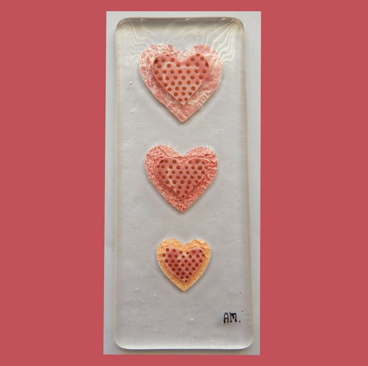 Handmade fused glass hearts has been made by combining a number of different techniques. The hearts are made from glassline paper which is fused in-between two pieces of glass. The foreground hearts are created by using glassline powder and dabs of glassline to create the pattern on the front of the glass. The coloured decoration is hand painted onto the front using glassline powders. This layering of colours gives a slight feeling of three-dimension.