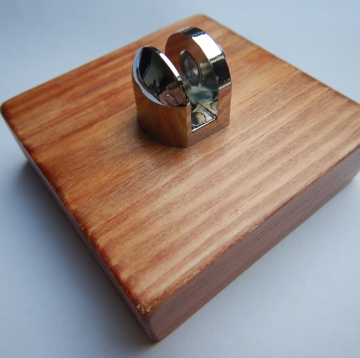 Materials: bullseye glass, glassline powders, wood base, steel bracket.