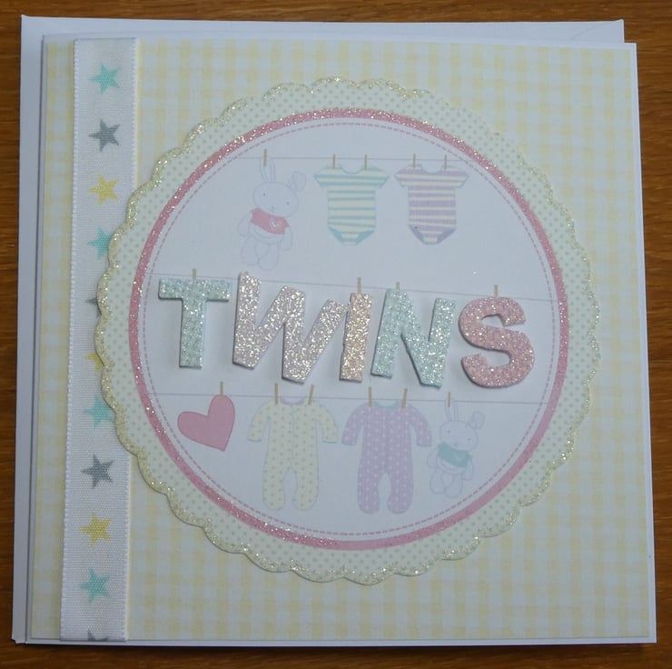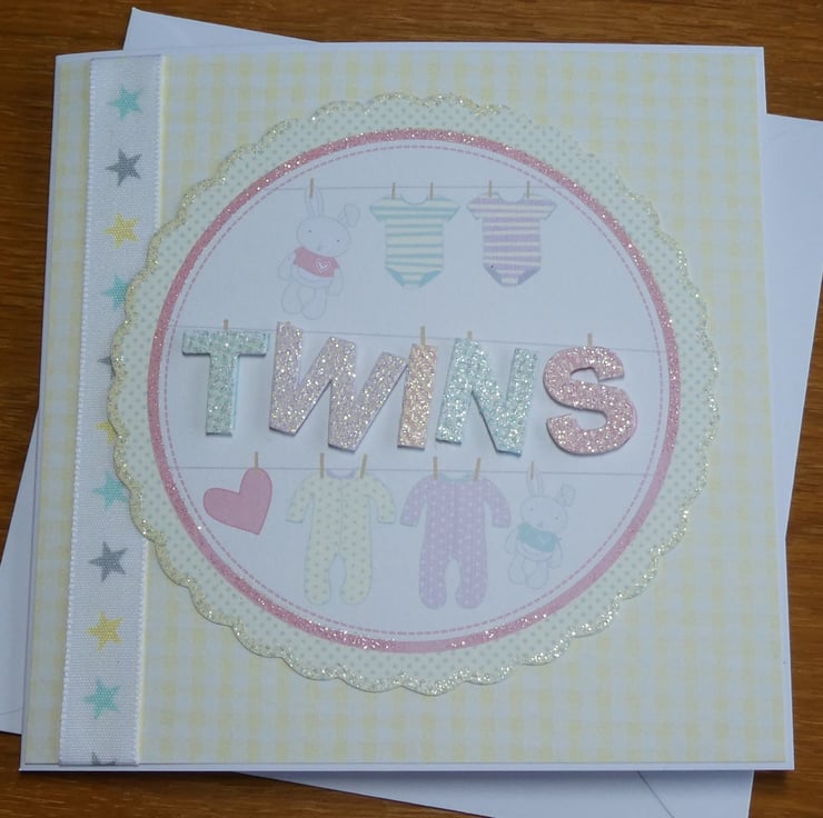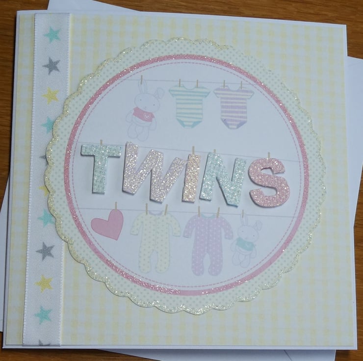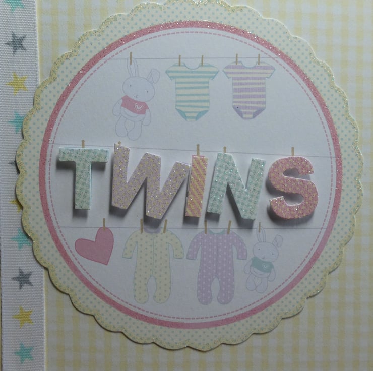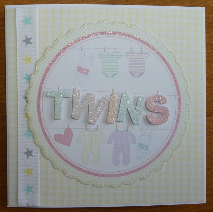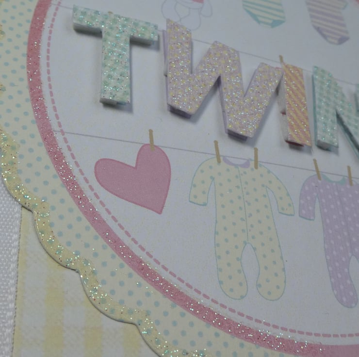 The word twins is highlighted in glittery letters, again looking as if they have been pegged to the line. The letters have been raised on foam pads to add dimension to the design.