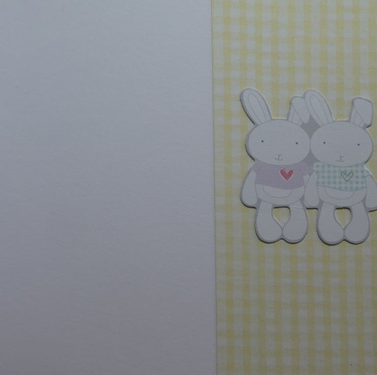 The inside of the card has been finished with a band of yellow gingham patterned paper down the right hand edge, topped with a cut out image of two bunnies.