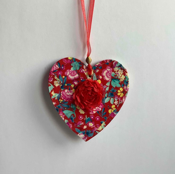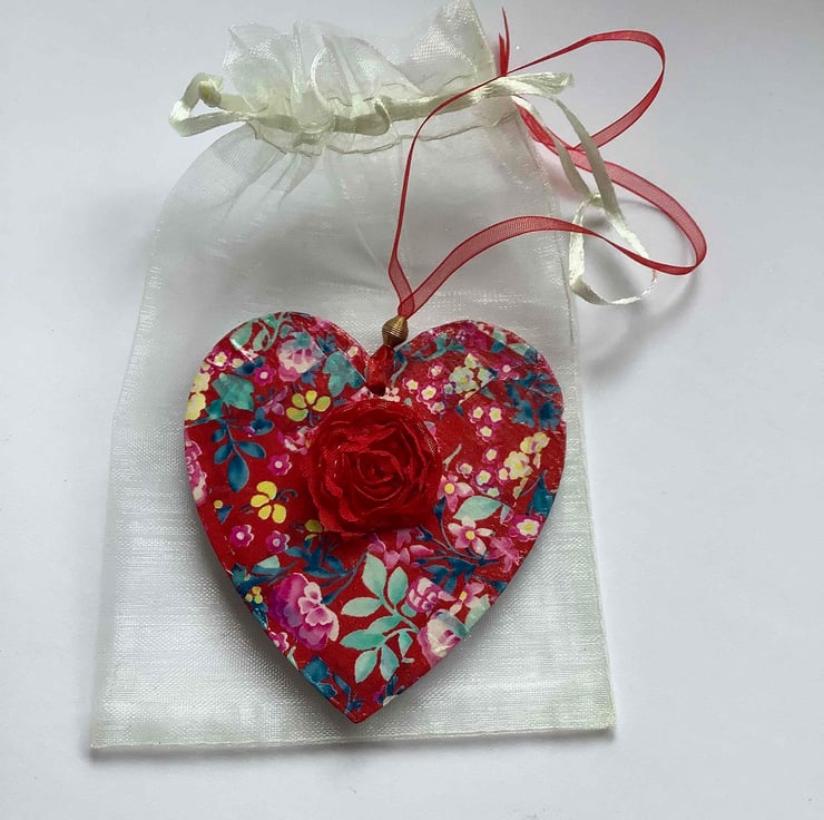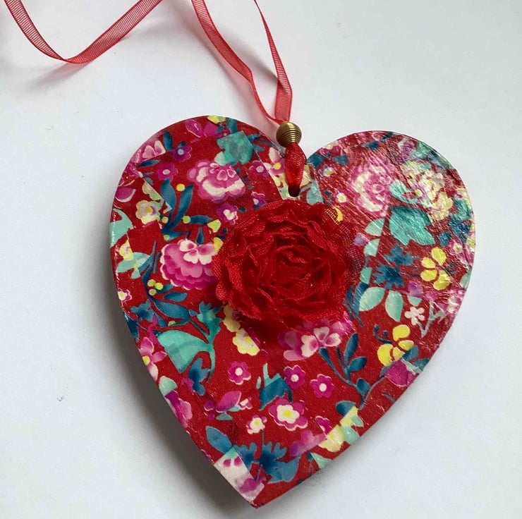 Both sides of this wooden heart have been decopatched in a red floral mix of colours and varnished.